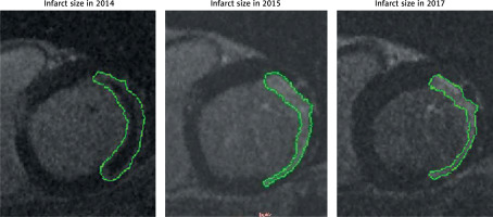 cMRI infarct size was reduced from 33.2 ±7.6 g (baseline) to 25.5 ±6.4 g (1 year) and 23.1 ±5.6 g (3 years); p = 0.03. Figure 4 shows typical evolution of cMRI infarct imaging throughout 3 years.