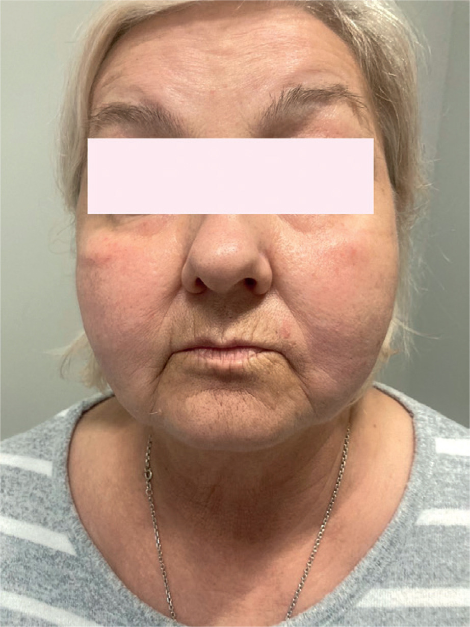 A 62-year-old Caucasian woman presented to the Dermatology and Allergy Department with a 5-year history of recurrent oedema episodes. The oedema was localized to the lower face and neck. The patient also had swallowing and breathing problems. Erythema and oedema also appeared around her eyes (Figure 1). The patient experienced chronic fatigue, excessive sweating, and vertigo. The standard urticarial treatment was ineffective. Hereditary angioedema was excluded. Lymph nodes located in the neck were palpable. Positron emission tomography confirmed proliferative enlargement of the cervical lymph nodes, and biopsy was performed. Histological imaging revealed an enlarged node with sinusoidal expansion and diffuse infiltration of histiocytes (CD163+; CD1a-, S-100+). Lymphoma was excluded. The image was indicative of RDD (Figure 2). The enlarged lymph nodes were further evaluated using immunohistochemistry, which revealed positive staining for CD163 and S-100, but negative staining for CD1a, supporting the diagnosis of RDD. The course of the disease was stable. The patient received prednisolone in the dose of 10 mg/day and methotrexate of 20 mg per week with folic acid of 15 mg per week, with a good clinical response.