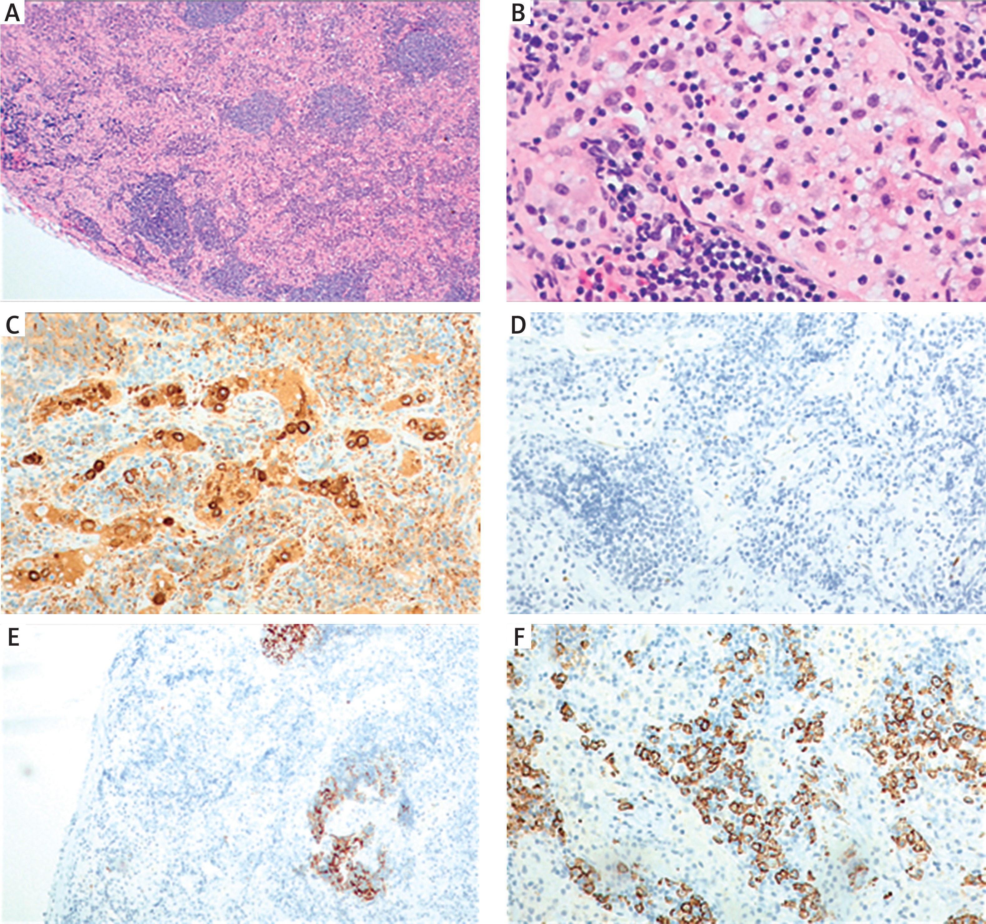 Histopathological image of a lymph node from a patient with Rosai-Dorfman disease. A, B – Haematoxylin & eosinstained sections showing distorted nodal architecture with expanded interfollicular zones containing numerous histiocytes with pale cytoplasm and emperipolesis (magnifications 40× and 400×, respectively). C, D – Immunohistochemistry highlighting large histiocytes with pale cytoplasm and emperipolesis (C – CD68-positive; D – CD1a-negative; both 200×). E – CD23 staining demonstrates a damaged but preserved follicular dendritic cell (FDC) meshwork within residual small follicles (100×). F – Marked plasmacytosis in CD138 staining in the interfollicular area (200×)