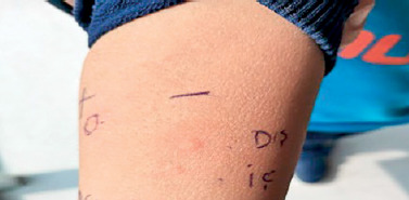 A 5-year-old male patient presented with complaints of urticaria, persistent vomiting, and coughing after consuming a black radish cure about 2 months ago. He had a history of runny nose, sneezing in the spring, and coughing that increased especially at night after he started school. Postnasal discharge was detected in the examinations and the cough was constantly recurring. In addition to medical drugs, the mother sought alternative treatment and applied the black radish cure including honey she heard about from her neighbor. The patient had previously been able to consume honey without any problems. He took a teaspoon of the mixture (black radish plus honey) in the morning, at noon, and in the evening. Approximately 4 h after the evening dose, red, itchy, raised urticarial lesions developed on the face and trunk, and the patient began to vomit repeatedly and cough. His complaints, which lasted for 0.5 h, disappeared over time and the family did not go to the emergency service. In our patient, the onset of recurrent vomiting and cough with urticarial lesions on the face and trunk indicated the development of at least 2–3 systemic manifestations and suggested that anaphylaxis developed as a generalized systemic reaction, albeit somewhat delayed. To confirm the diagnosis of the patient who did not have active complaints during the examination, a skin prick test was performed with inhaled allergens, and a prick-to-prick test was performed with the extracts inside and outside of the black radish. Negative control: 0 mm, histamine 4 mm, meadow grasses 4 mm, and black radish 4 mm induration (Figure 1). Since there was no routine approach previously described with radish, we applied the prick-to-prick test ourselves, to 3 individuals, with the same radish for avoiding irritant reaction, and induration did not occur on them. The patient’s allergic rhinitis symptoms were attributed to grass pollen allergy. Since the patient did not have any problems when he ate honey after anaphylaxis, a prick test was not performed with honey. In the blood tests, the total IgE was 1,060 IU/ml and there was no eosinophilia. The patient was found to be allergic to grass pollen and radish. The patient was able to consume the same group of root crops/vegetables e.g., carrots and celery without any problem. The patient was instructed to avoid eating radish and an adrenaline autoinjector was prescribed. The patient was still advised to be careful while consuming root crops since we were not able to perform food challenges with all of them. The fact that the patient was able to consume the same group of root crops/vegetables, such as carrots and celery, without any problems reduced the possibility of developing cross-reactions between these groups of vegetables in our patient. Although we asked for testing with honey or other vegetables that might cross-react, the family was non-compliant and would not allow further testing. (Informed consent was obtained from the patient’s relatives for this presentation.)