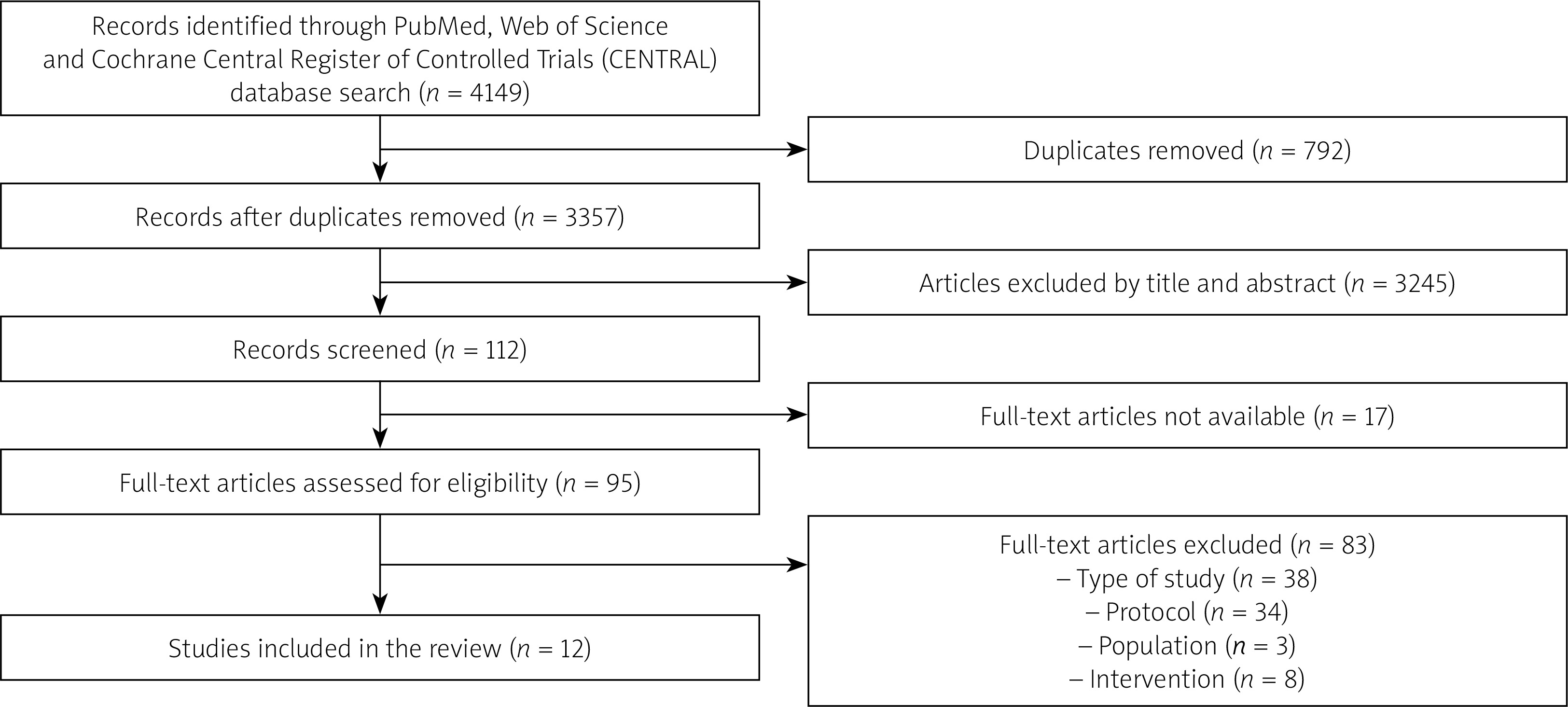 A total of 4149 bibliographic entries were found. Bibliographic references were managed with the Zotero program. Compliance of the articles with the selection criteria was assessed in two stages. During the first stage, duplicates were removed and studies were selected that, according to the title and abstract, possibly met the study selection criteria. A total of 112 publications were selected during this stage. During the second stage, the compliance of the studies with the established criteria was assessed by analysing full-text articles. A total of 12 articles were selected, the results of which were described and presented in tables. The article selection process and its stages are presented in Figure 1.