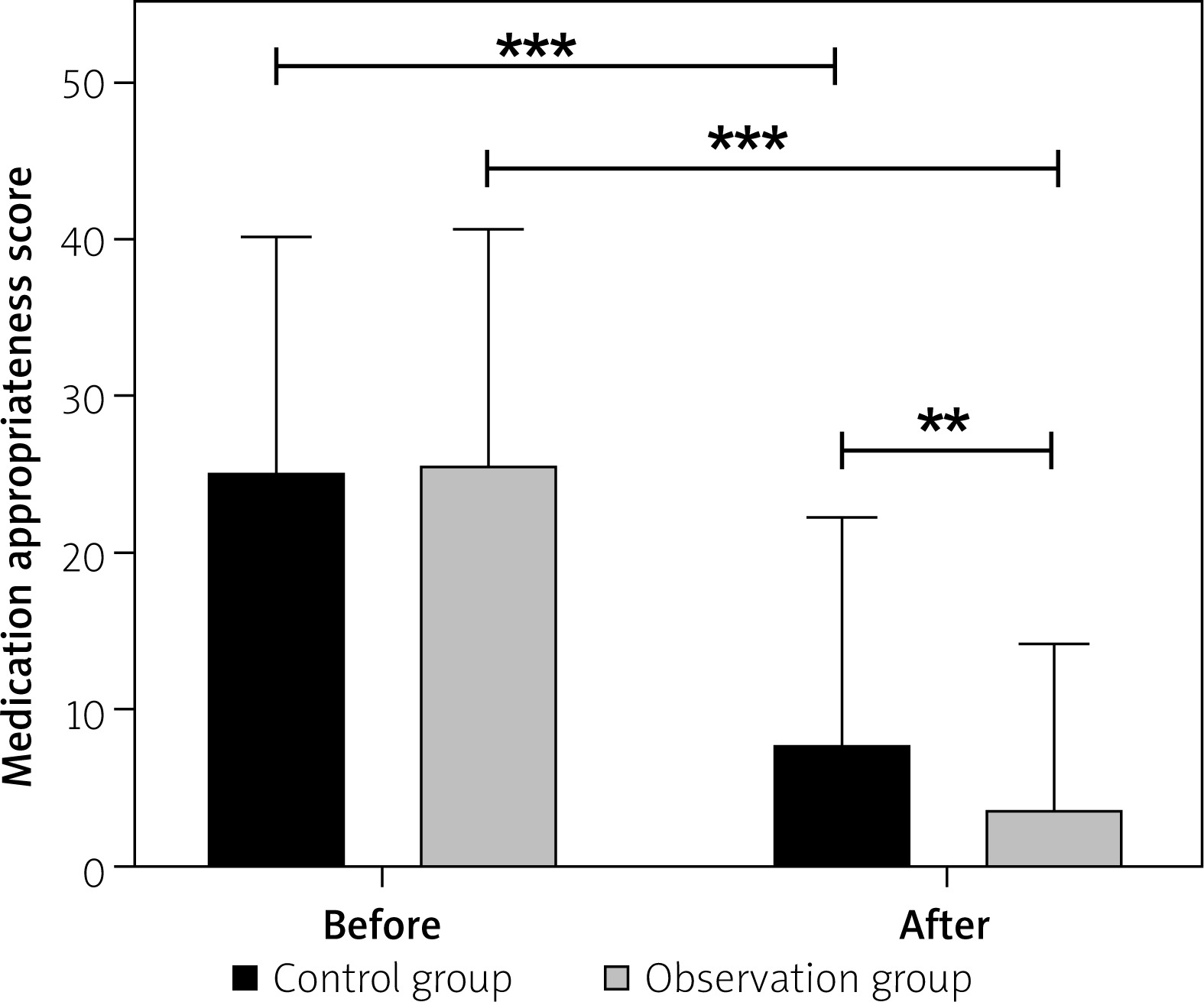 Prior to pre-prescription evaluation, the appropriateness of medication use was comparable across groups (p > 0.05). After review, both cohorts exhibited enhanced prescribing accuracy, with the observation group demonstrating a more pronounced improvement relative to controls (p < 0.05) (Table II, Figure 1). The MAI inappropriateness rate showed no significant difference between the control and observation groups before the review (p > 0.05). After review, the MAI inappropriateness rates in both groups were lower than those before the review, with the observation group exhibiting a significantly lower rate (15.7%) compared to the control group (25.7%) (p < 0.05) (Table II).