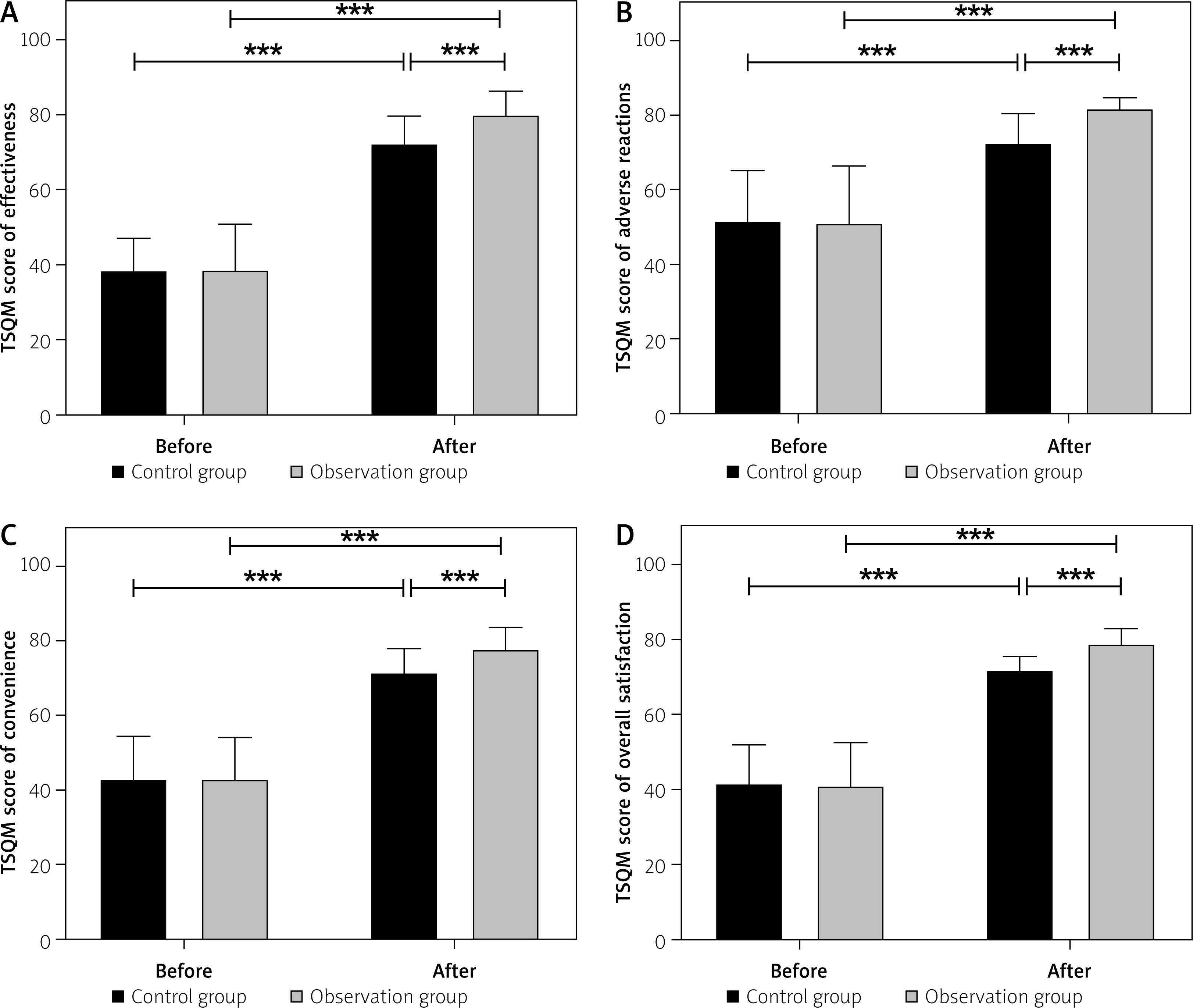 Before the review, there were no significant differences in the four dimensions of medication satisfaction scores between the two groups (p > 0.05). Following the review, overall satisfaction scores improved significantly in both groups compared to baseline (p < 0.05). Specifically, the observation group demonstrated higher scores in perceived treatment effectiveness, adverse reaction awareness, convenience, and overall satisfaction than the control group, with all differences reaching statistical significance (p < 0.05) (Table VI, Figure 2).