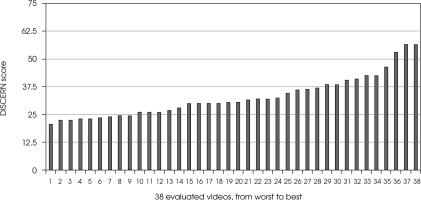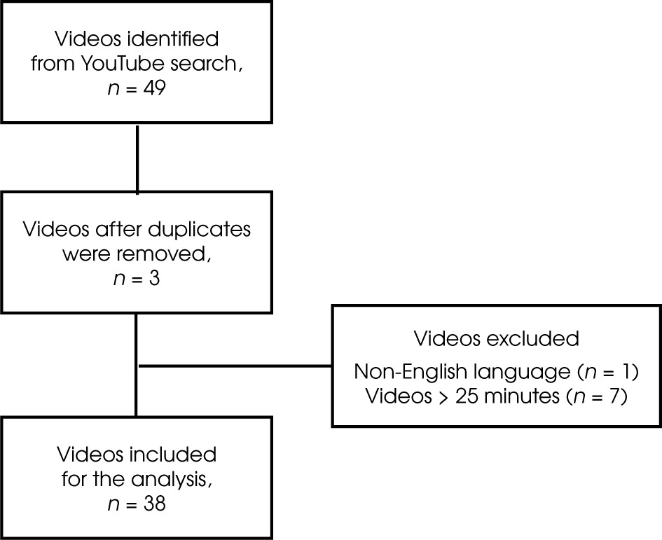 Out of the 49 videos analyzed, we excluded 11 for the following reasons: 7 were longer than 25-minutes, 3 were duplicated, and 1 was a non-English video. In consequence, a total of 38 videos were assessed (Figure I). The overall statistics concerning viewer interaction were measured: the total view count was 12,741,214 (mean, 344,357; range, 8,455-2,734,582). The following are the mean and range for all the quantitative video metrics for all the videos analyzed: number of likes (mean, 7,238; range, 57-66,000), number of comments (mean, 763; range, 3-4,478), total duration of all videos 4 h 24 min. 52 sec. (mean, 7 min. 9 sec.; range, 1 min. 37 sec – 17 min. 10 sec.) (Table 3).