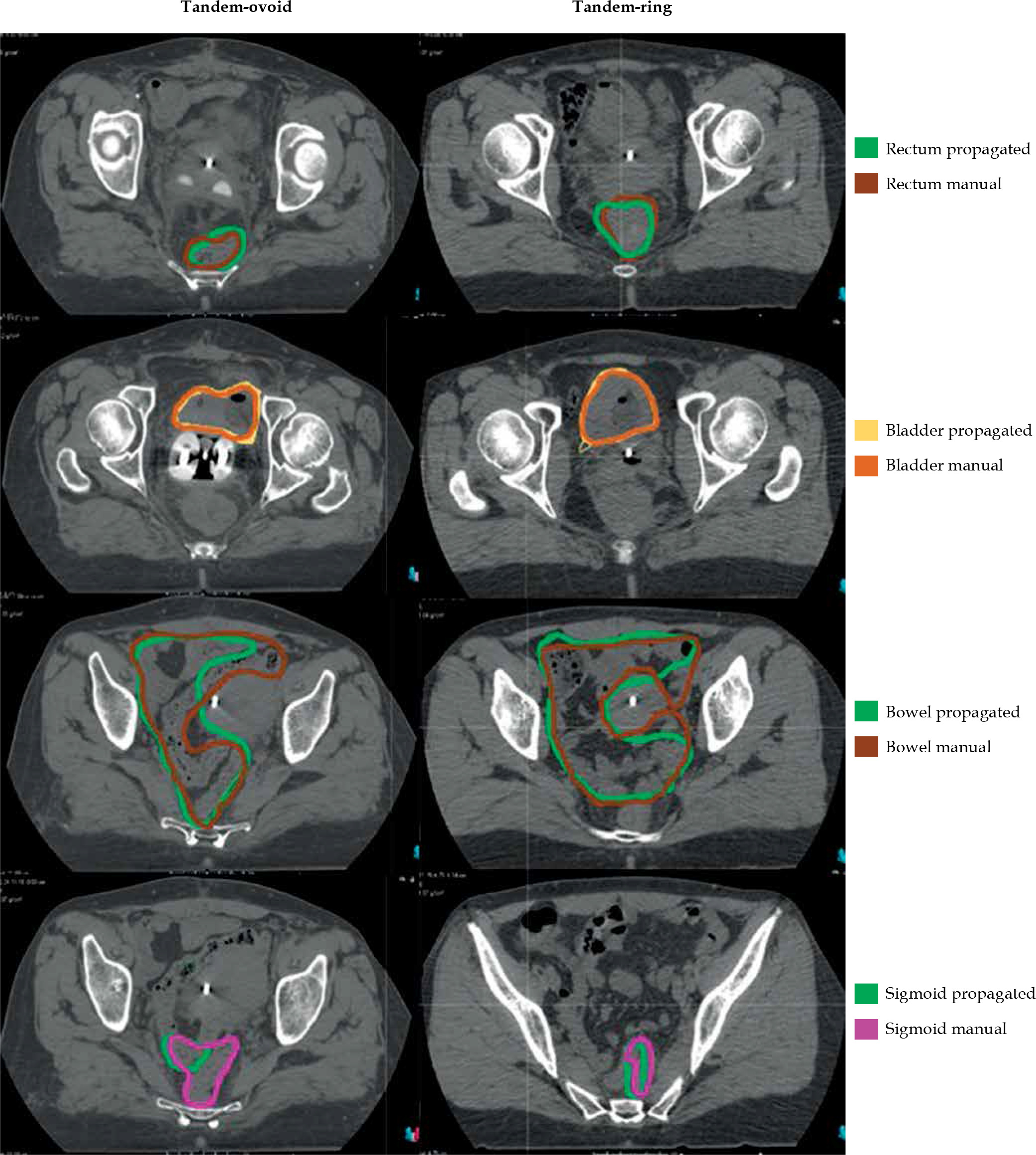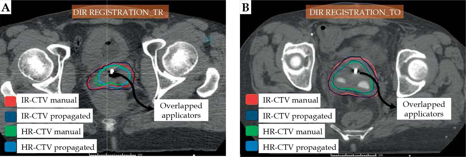 Figure 1 displays CT images of two patients who underwent T-R and T-O insertion each. In both insertions, the overlapping of the applicators was provided with DIR. Figure 1 also shows HR-CTV and IR-CTV volumes, which were delineated manually or automatically. Comparisons of manual and automatically-propagated contours of OARs for these patients are provided in Figure 2.