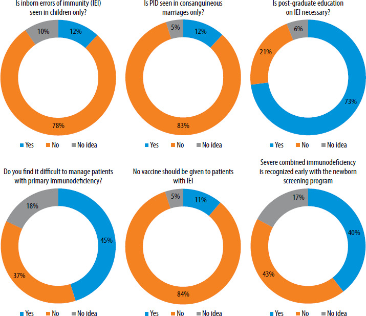 Most participants (78%) were aware that IEI is not limited to childhood and 83% recognized that it is not only caused by consanguinity. Additionally, 82.9% believed that pediatricians in general are insufficiently informed about IEI. Regarding newborn screening, nearly half of the participants (47.6%) emphasized the importance of including IEI (Figure 1).