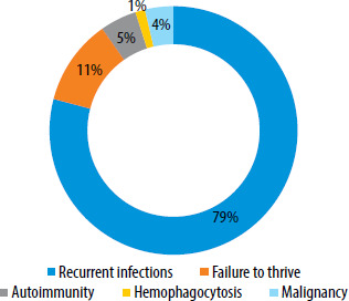 In adults, the most common indicators of IEI were opportunistic infections (83.3%), unexplained skin lesions or wounds (79.5%), and chronic fungal infections (77.9%). Less commonly linked signs included a single episode of pneumonia per year and hyperplasia of secondary lymphoid organs. The participants were also questioned about the most common clinical presentations of IEI (Figure 2).