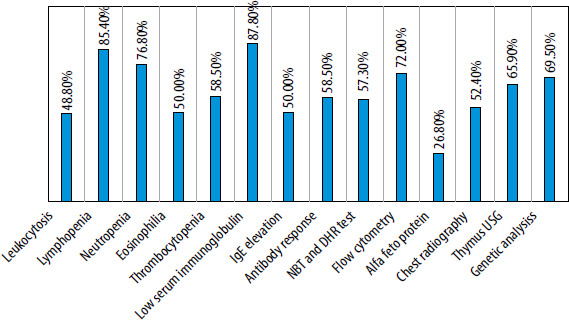 The most frequently cited diagnostic laboratory findings were low serum immunoglobulin levels (87.8%), lymphopenia (85.4%), neutropenia (76.8%), and flow cytometry for T and B cell counts (72%). The least helpful ones were alpha-fetoprotein levels (26.8%), leukocytosis (48.8%), and eosinophilia (50%) (Figure 3). The most well-known treatment was hematopoietic stem cell transplantation (85.2%), followed by antimicrobial prophylaxis (84%) and immunoglobulin replacement therapy (81.5%). Enzyme replacement and gene therapy were the least recognized treatment options.
