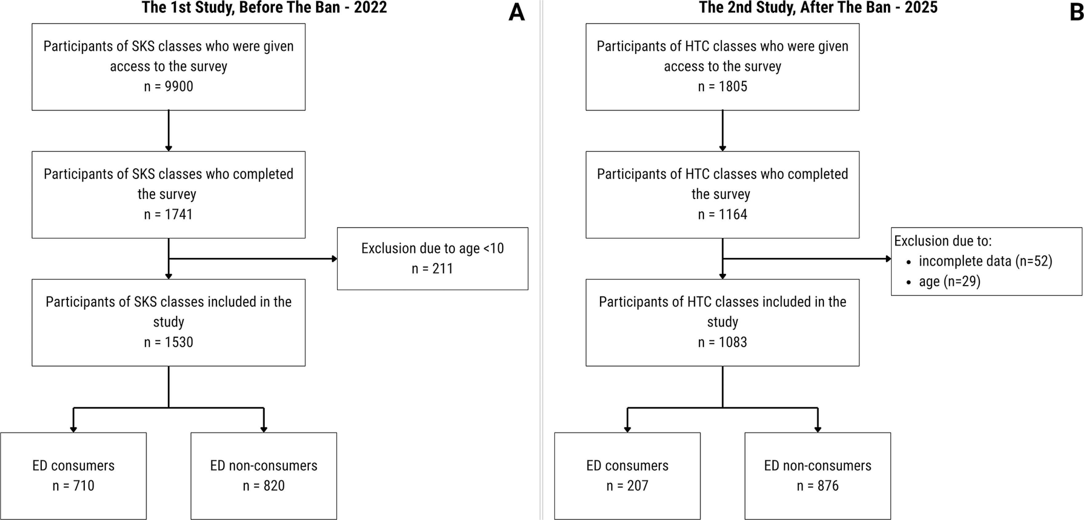 The methodological details of the 2022 study have been reported elsewhere [11]. Briefly, a nationwide web-based survey was conducted among primary school students aged 10–14 years participating in an extracurricular school sports programme. Data were collected between October and November 2022, i.e., prior to the national ban on the sale of EDs to minors. The questionnaire was completed anonymously during additional sports classes, with teachers facilitating access to the online survey. Approximately 9900 students were reached and 1741 provided complete responses. Regarding the second study: a nationwide online survey was carried out between May and August 2025, one and a half year after the restriction on selling EDs to minors was implemented. The questionnaire was addressed to physically active children aged 11 to 15 years, corresponding to the SKS cohort examined in the initial study from 2022. Therefore, the survey conducted in 2025 focused on primary school students in grades 4 to 8 who participated in the HTC program. The questionnaire together with information for study participants was made available to 1805 students. Data were collected during extracurricular sport classes and in summer sport camps. Parents provided consent, and students gave assent, within the standard consent process for class participation. Upon our request, the teachers conducting the extracurricular handball classes provided students with a QR code that linked to the survey. The students completed the survey anonymously on their mobile phones, but in the presence of a teacher who could answer any questions in case of doubt. Access to the QR codes was restricted to teachers employed within the program, which minimized the possibility of children outside the target group completing the survey. In total 1164 has responded to our request (Figure 1). Therefore, the response rate was 64.5%. We had to exclude 52 participants due to incomplete data and 29 due to age < 11 or > 15 years. After all exclusions, the data of 1083 students were included in the final study sample. The number of participants by province is shown in Table S1 in the Supplementary Materials.