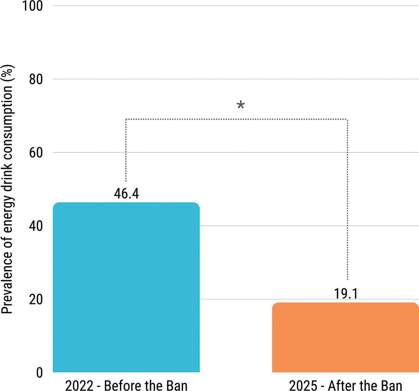 Prevalence of energy drink consumption among physically active adolescents before (blue) and after (orange) the introduction of the sales ban for minors. Statistically significant differences (p < 0.05, χ2 test) are indicated by *.