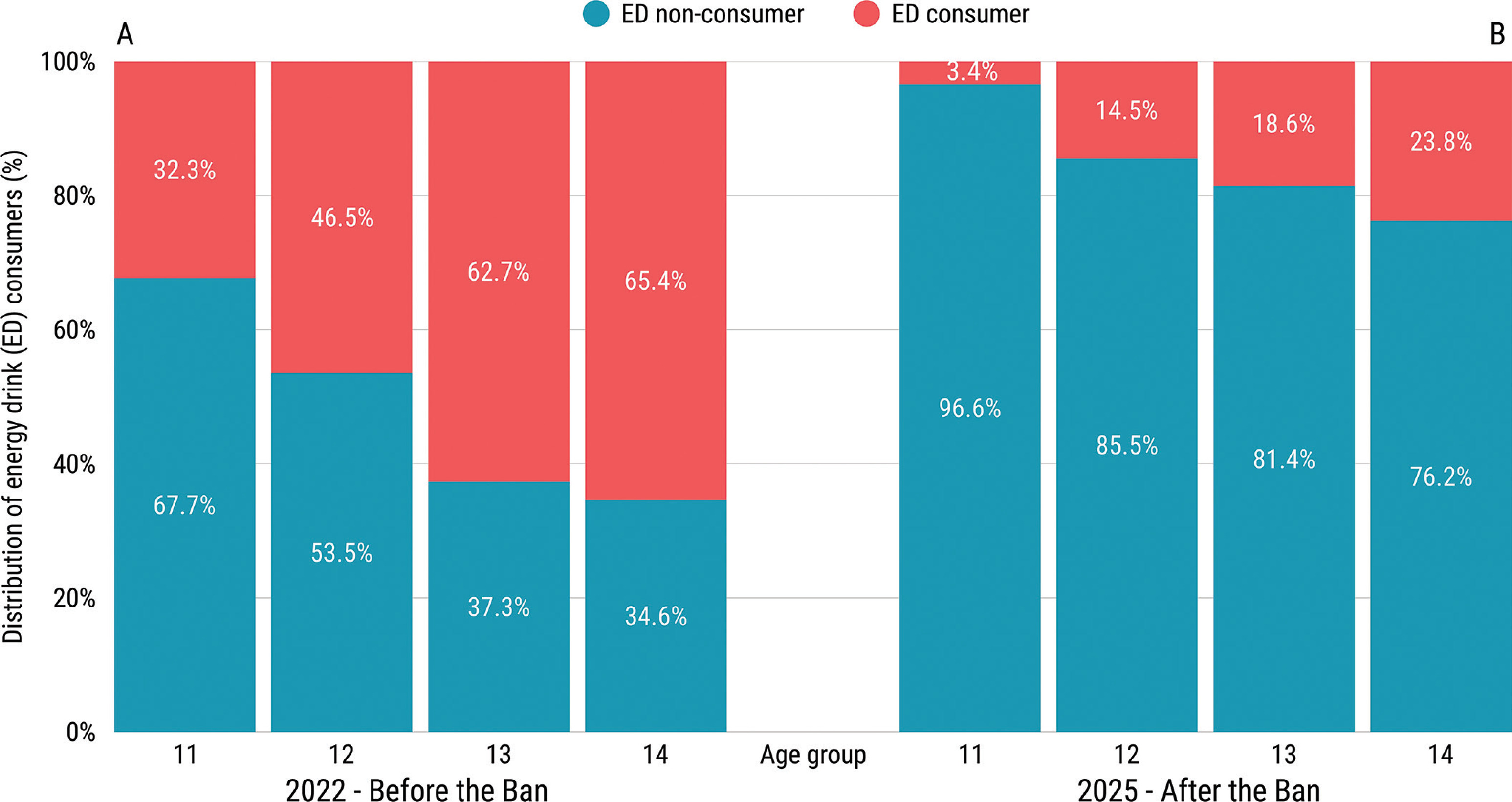 Distribution of energy drink (ED) consumers among various age groups – comparison between the time before (A) and after (B) the sales ban to minors. χ2 test revealed statistically significant differences in the proportion of ED consumers between 2022 and 2025 in all age groups (p-value < 0.001 for all comparisons).