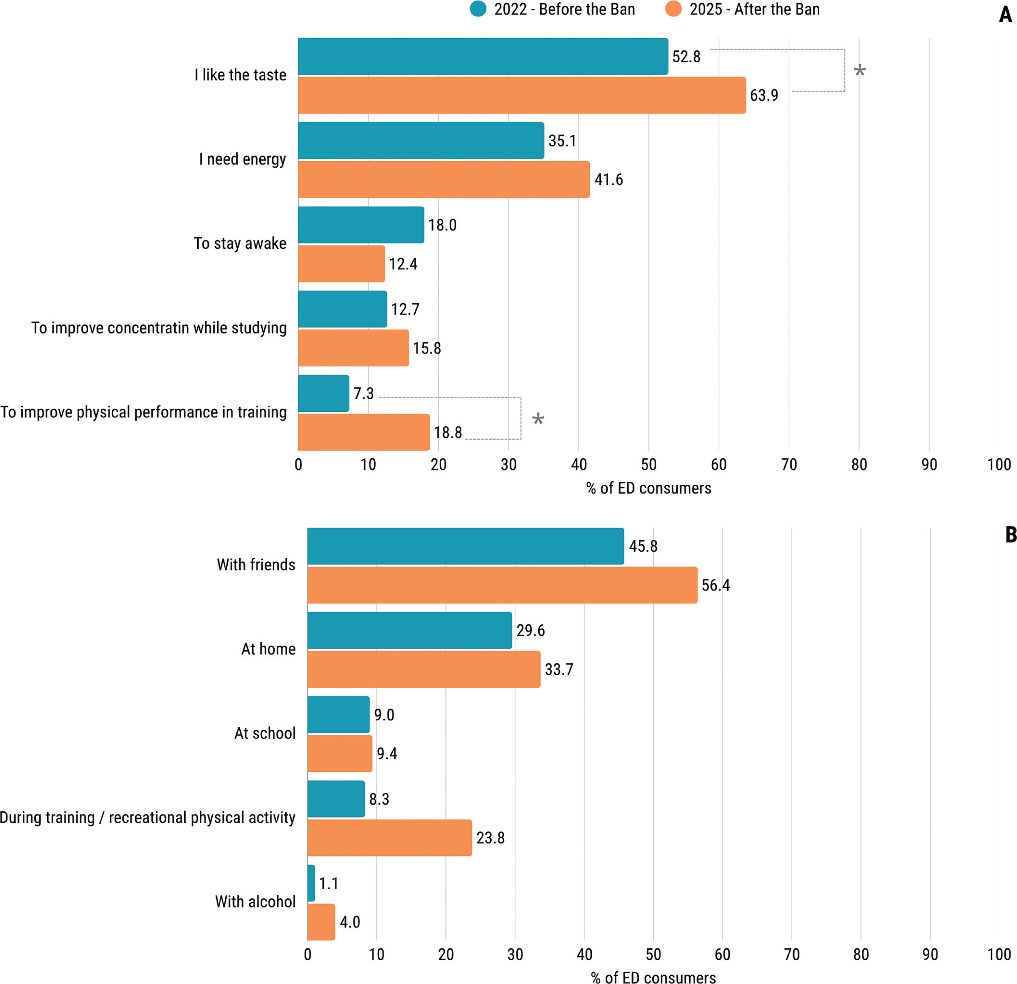 The most frequently reported reason for ED consumption, both before and after the ban, was their taste (52.8% and 63.9%), as shown in Figure 4A. Significantly more consumers selected the response “I like the taste” after the sales ban than before (p = 0.007). In the 2025 study, a significantly higher proportion of consumers selected the response “to improve physical performance in training” compared with the 2022 study (p < 0.001). With regard to the circumstances of ED consumption (Figure 4B), both studies found that consumption with friends (45.8% before the ban, and 56.4% after the ban, p = 0.009) and at home (29.6% before the ban, and 33.7% after the ban, p = 0.305) were the most common. Significantly more participants reported consuming EDs during training in the 2025 study compared with the 2022 study (23.8% vs. 8.3%, p = 0.002). An increase was also observed in the combination of EDs and alcohol, from 1.1% before the ban to 4.0% after the ban (p = 0.016).