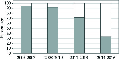 Trend change of treatment modalities in our 15-year LDR experience. Modality ratio among LDR monotherapy (white bar) and combination therapy with LDR and EBRT (gray bar) for 3 years are shown