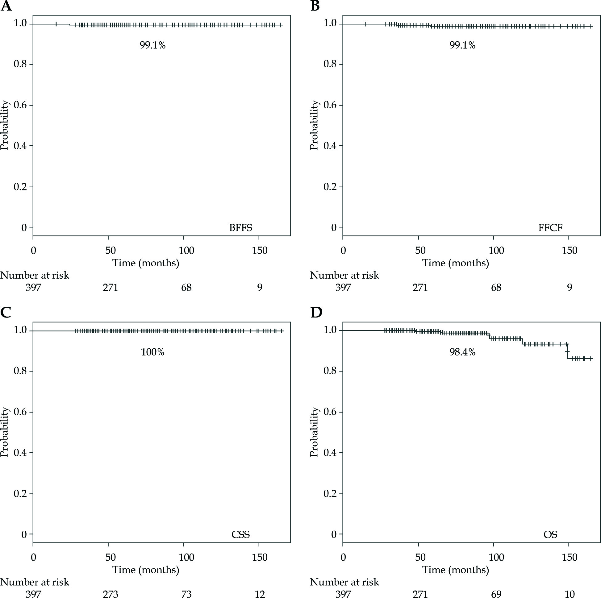 Biochemical failure-free survival was calculated for all living patients and reflected biochemical failures. FFCF survival rate was calculated for all living patients and reflected clinical failure events (local, regional and distant failure). CSS reflected prostate cancer-specific death. OS reflected all deaths, cancer related or unrelated.