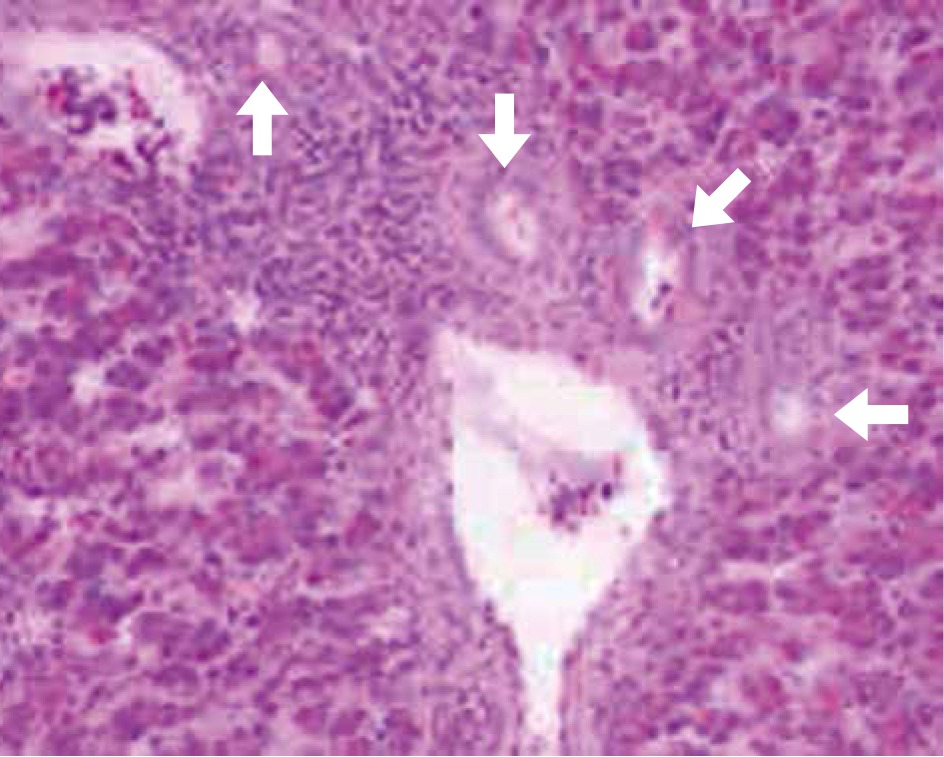 The characteristics of the studied patients are presented in Table 1. Histopathological features were observed in all liver specimens including the presence of lymphoid aggregation in portal tracts, variable degrees of steatosis and bile duct proliferation as shown in Figures 2 and 3. According to the METAVIR scoring system in regards to the fibrosis stage, 12 (48%) patients in group A showed F1, 12 (48%) patients showed F2 and only one (4%) patient showed F3. Patients in group B were found to have a significant increase in the fibrosis stage, where six (24%) showed F1, 12 (48%) showed F2 and seven (28%) patients showed F3.