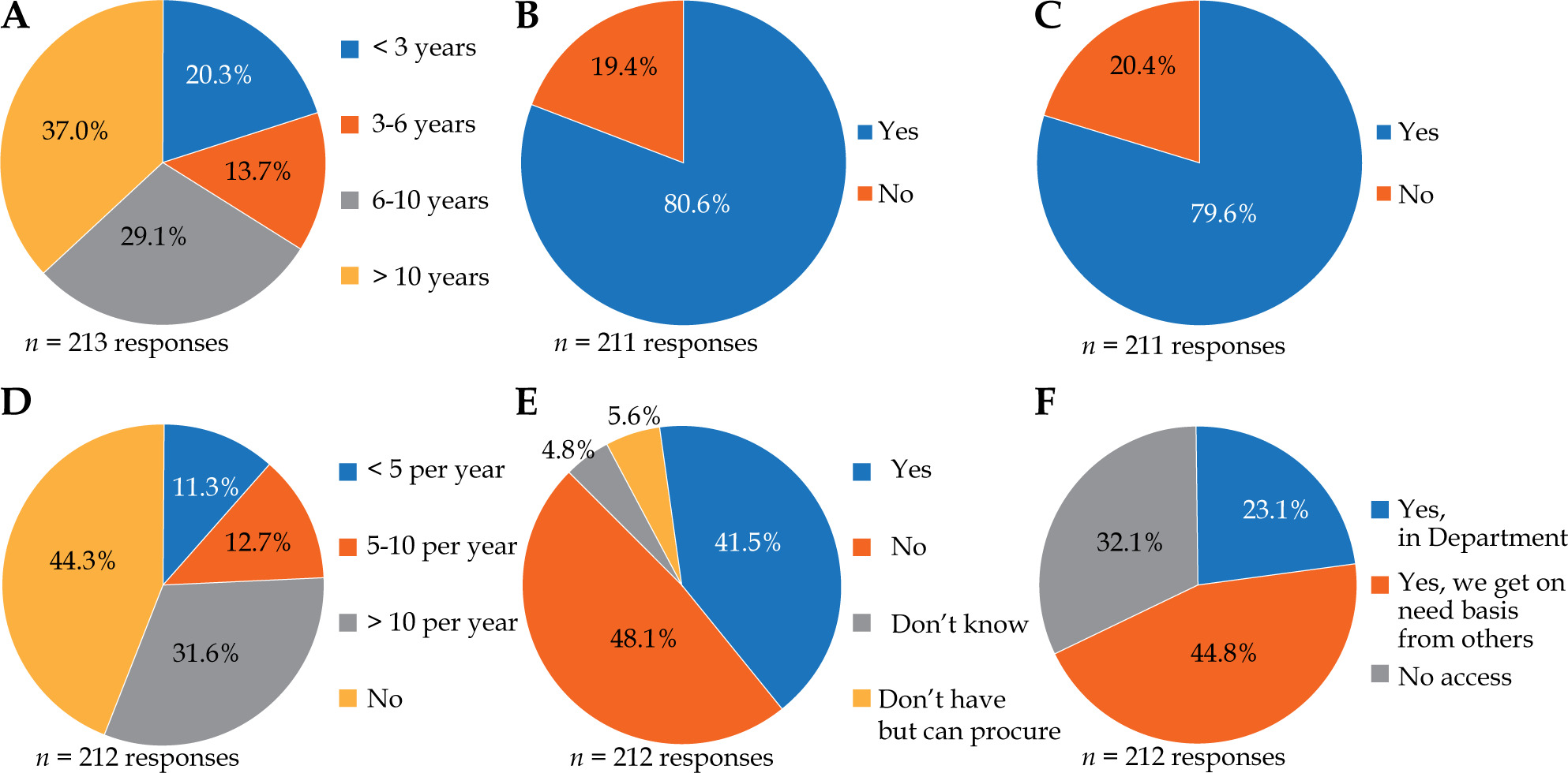 Responses in: A) years in practice after speciality training, B) IGRT facility to treat prostate cancer, C) availability of HDR facility, D) practice of interstitial BT for all sites, E) availability of prostate BT template/needles, F) access to trans-rectal ultrasound (TRUS)