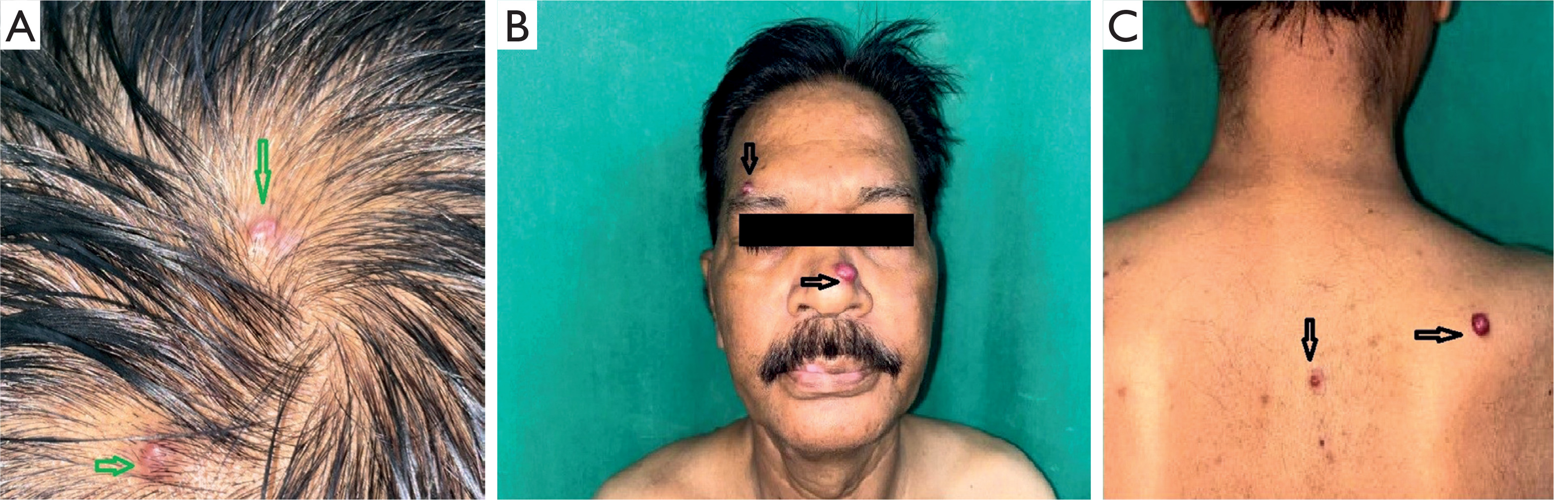 Clinical photographs showing multiple non-tender, firm, reddish angiomatous nodules measuring 0.5–1.5 cm on the scalps (green arrows) (A), face (black arrows) (B) and back (black arrows) (C)