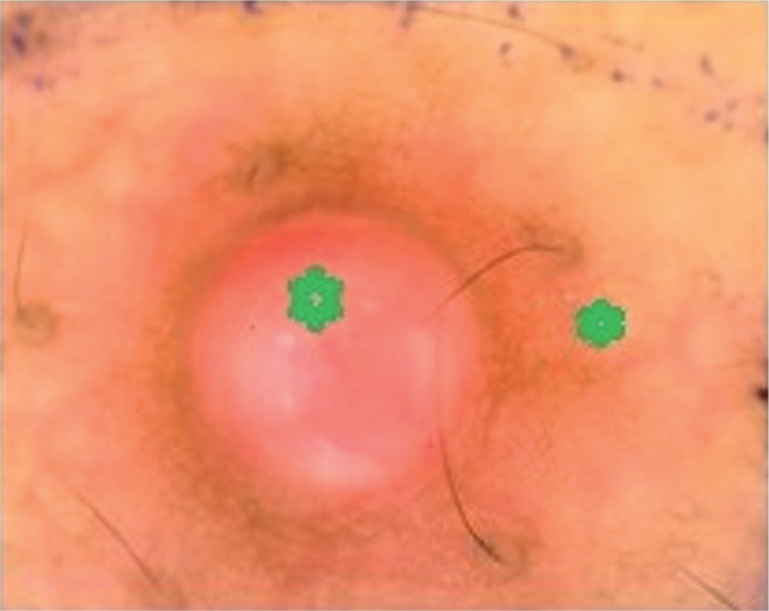 Dermoscopy showing arborizing and tortuous vessels (green stars) surrounding central lacunae over translucent nodules