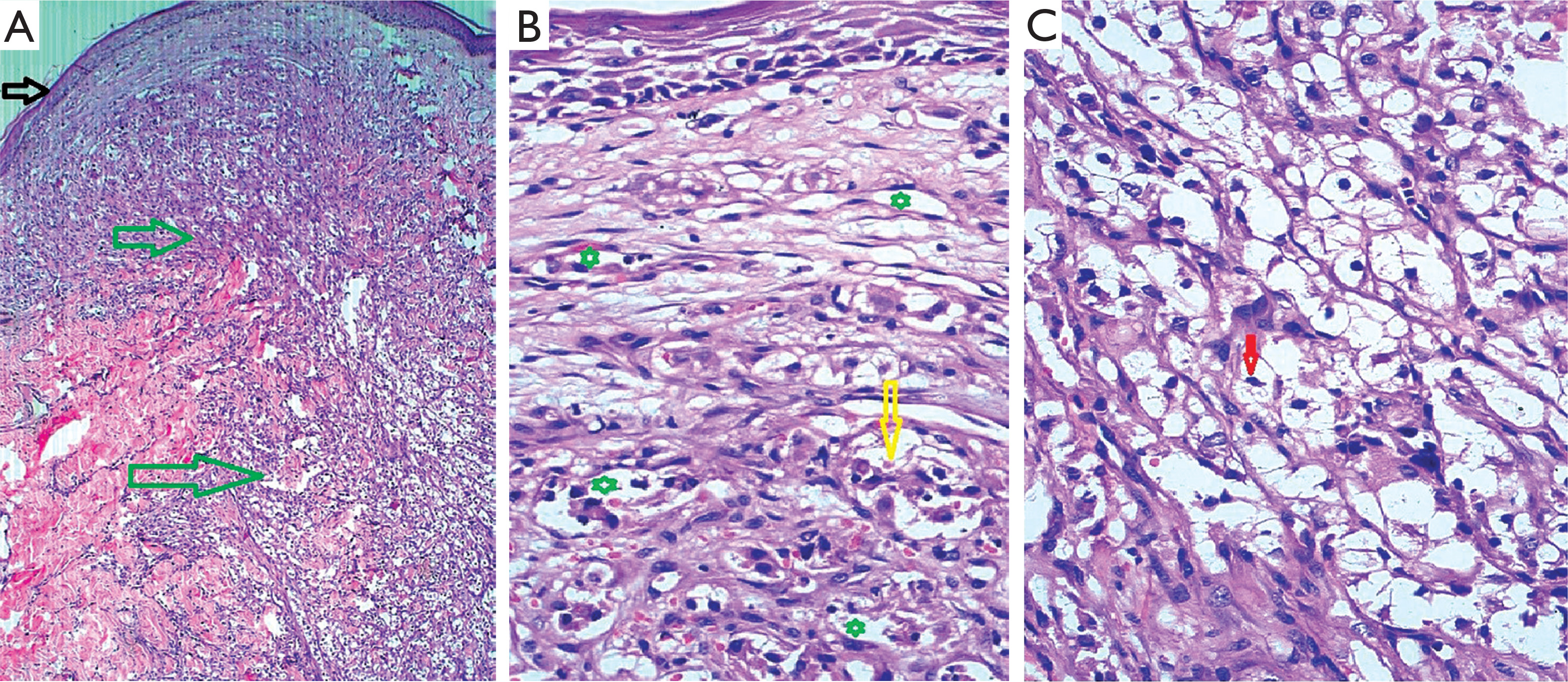 Photomicrographs showing attenuated epidermis (black arrow) with pan-dermal interstitial sheets of clear cells (green arrows) (H&E, ×4) (A). Increased dermal vascularity (neoangiogenesis) (green stars), with intravascular clusters of atypical cells (yellow arrow) (H&E, ×20) (B). Clear cells with centrally placed cleaved nuclei (red arrow) showing an interstitial growth pattern (H&E, ×20) (C)