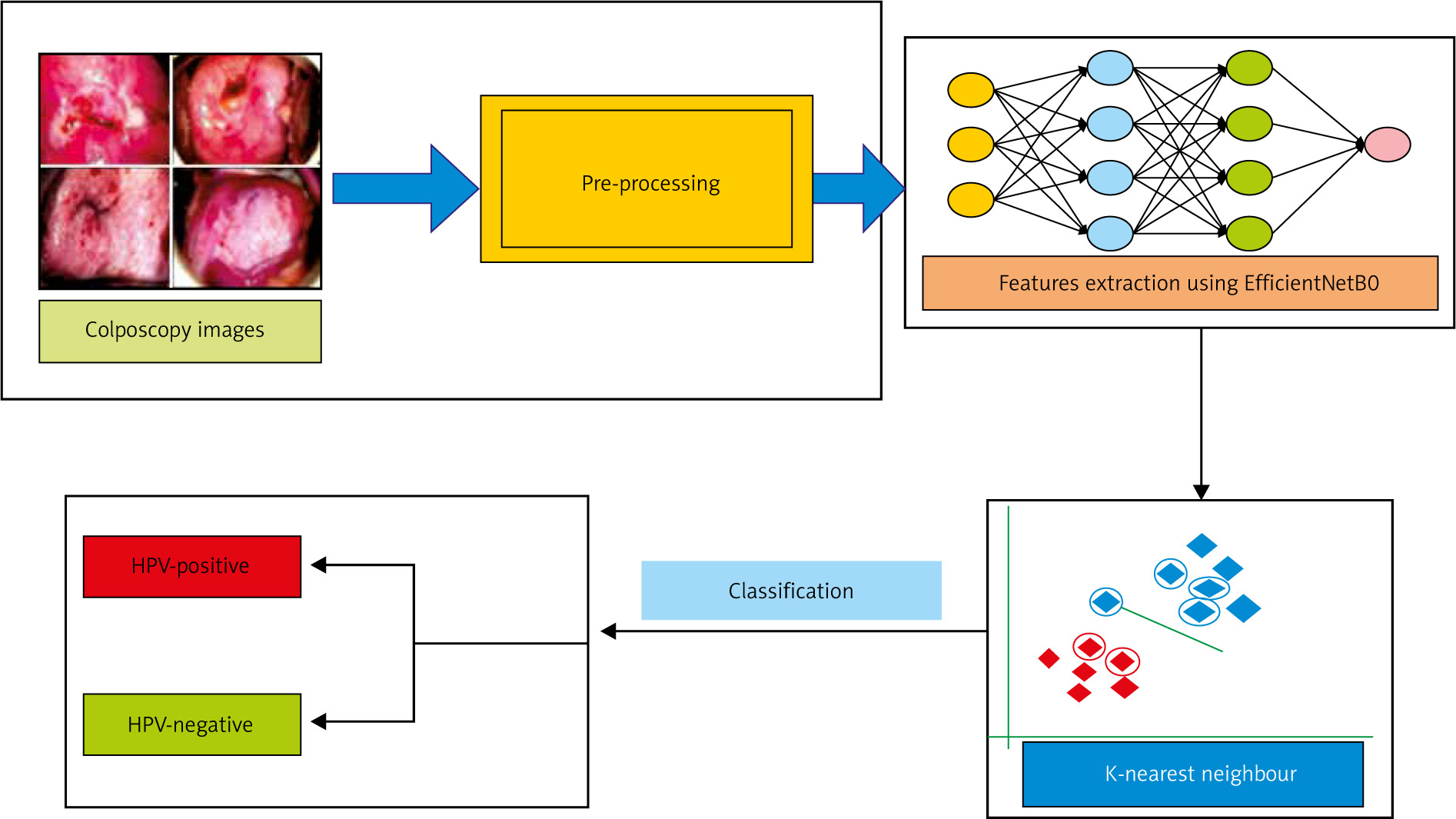 Colposcopy models were employed in a methodical fashion to categorise HPV images. An extensive dataset was initially compiled and subsequently augmented to ensure a robust model training and to enhance diversity. Following this, we trained the EfficientNetB0 architecture, which is renowned for its efficient data collection of pertinent information, to extract features from colposcopy images using the improved dataset. A comparative analysis of 19 distinct CNN configurations was conducted to ascertain the optimal CNN for the given task. The selection criteria for identifying a model that performs exceptionally well in HPV categorisation were determined by employing accuracy metrics. Following this, the chosen model was modified by utilising the KNN classification algorithm. Precise predictions were generated by identifying patterns within the feature space using this approach. A robust and precise HPV classification system was ensured through the implementation of this all-encompassing strategy, which incorporated data augmentation, effective feature extraction, model selection, and KNN algorithm fine- tuning. Figure 3 illustrates a simplified description of the proposed methodology.