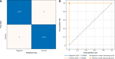 The confusion matrix and AUC for the validation dataset are presented in Figure 4. The results revealed an impressive accuracy of 99.9%, indicating exceptional classification performance of the model. Additionally, the AUC for validation was 99.86%, emphasising the robustness of the model in assessing the ROC curve. These metrics, displayed graphically, affirm the efficacy and reliability of the proposed methodology for HPV classification using colposcopy images.