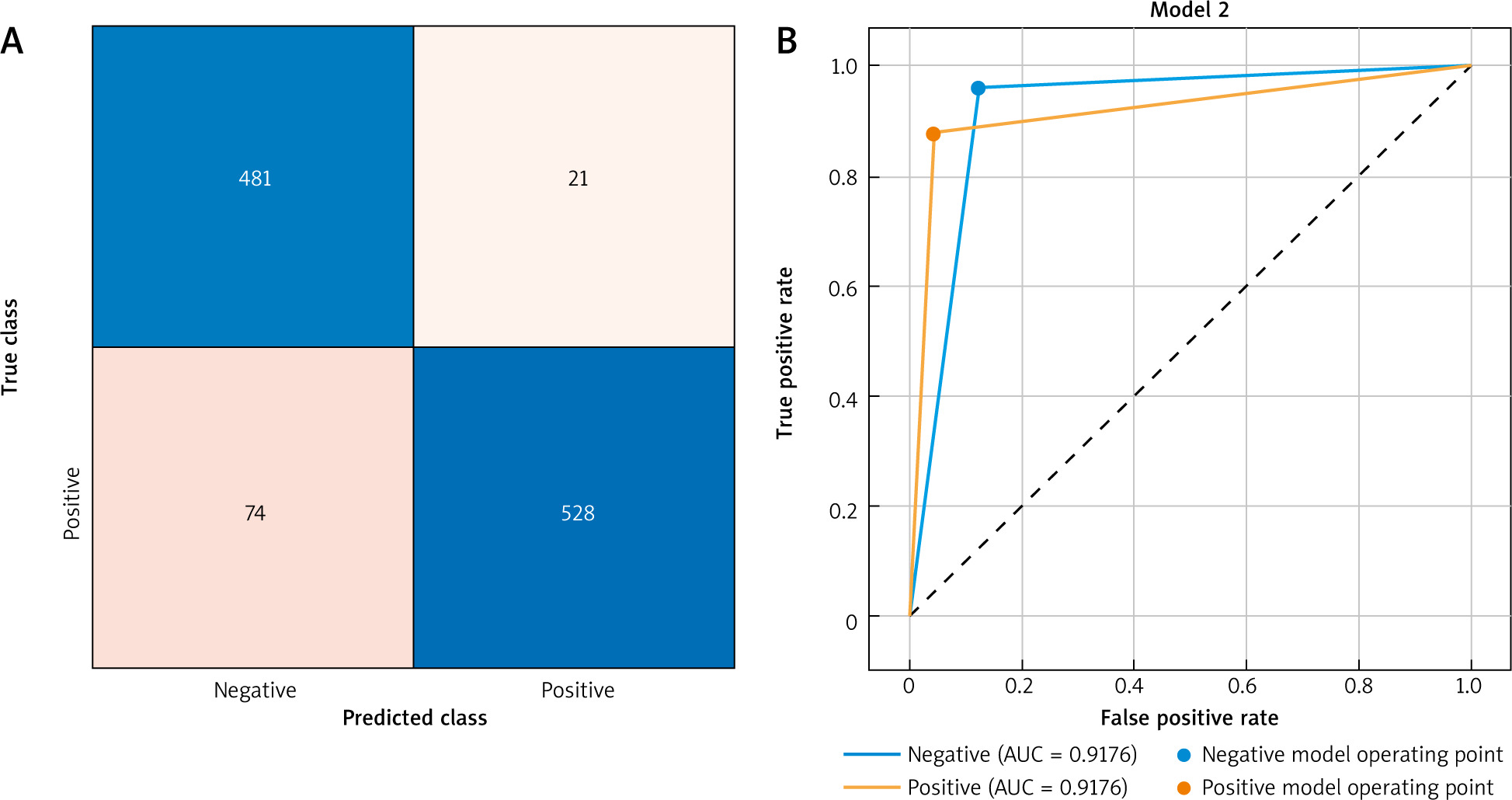 A concise overview of the performance of the model on the test dataset is presented in Figure 5, which incorporates the confusion matrix and AUC. The 91.4% accuracy rate of the model demonstrates its utility in the classification of assignments. Furthermore, the efficacy of the model in analysing the ROC curve was underscored by a test data AUC of 91.76%. The results are shown in Figure 5. These results demonstrated that the proposed method for classifying HPVs using colposcopy images is dependable and efficient, particularly when evaluated using fresh data.