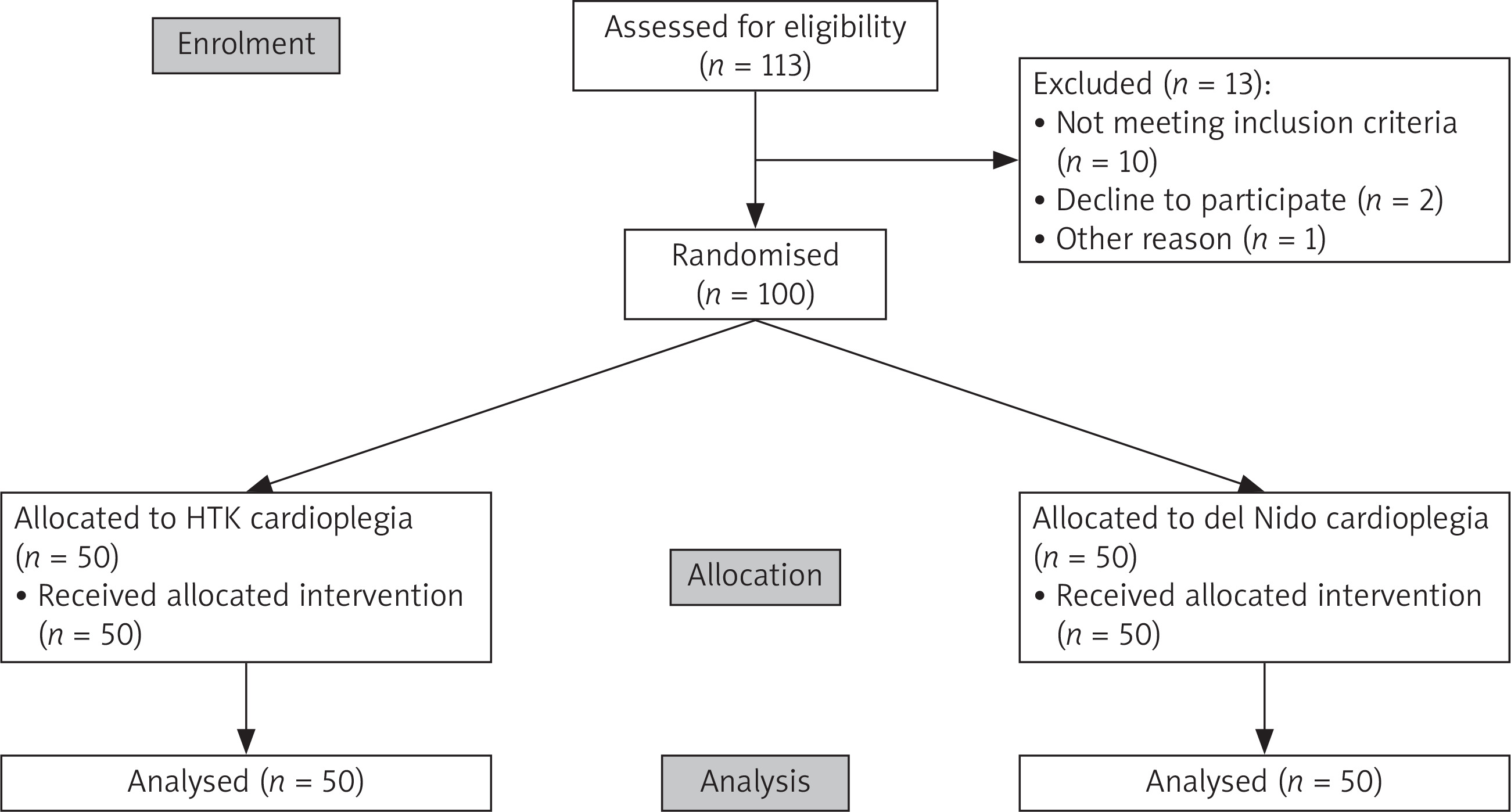 The study was conducted in accordance with the principles outlined in the Declaration of Helsinki. The study protocol received approval from the institutional ethics committee and the hospital’s research commission (NKBBN/203/2018). It was a single-centre, parallel randomised study with a 1 : 1 allocation ratio, involving 100 patients. All participants provided obligatory informed written consent before surgery. The manuscript was prepared in accordance with the CONSORT statement guidelines.