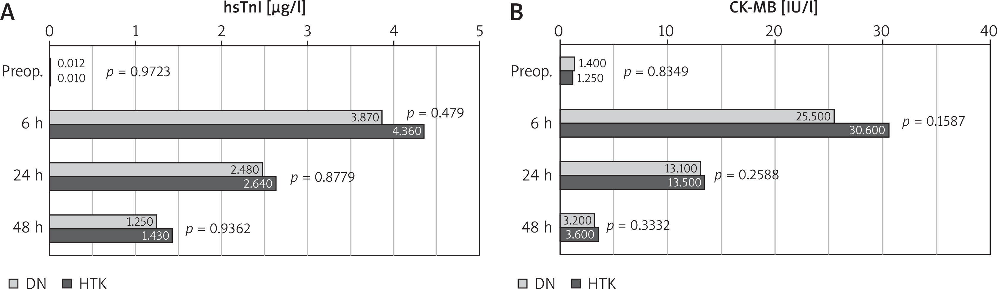 Baseline data are presented in Table I. The groups were similar in terms of demographic information, comorbidities, and baseline laboratory results, except for preoperative sodium levels, which were higher in the HTK group. Additionally, preoperative levels of hsTnI and CK-MB were comparable between the groups.