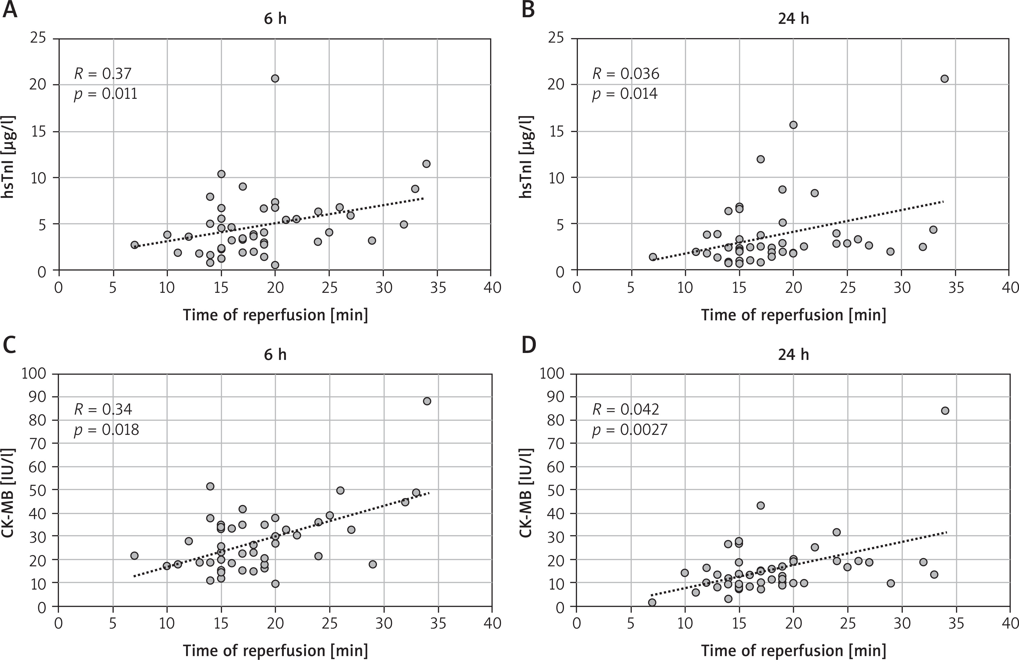 The levels of hsTnI and CK-MB at all three postoperative time points were similar between the groups, with the highest values observed 6 hours after surgery for both cardiac markers (Figure 2). We identified a positive correlation between reperfusion time and both hsTnI and CK-MB levels in the DN group at both the 6th and 24th postoperative hours (Figure 3). However, no correlation was found between the XC and any cardiac marker levels in either group.