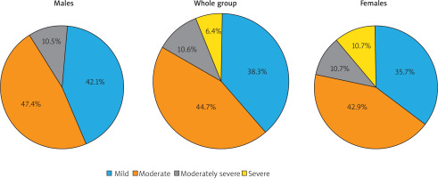 Symptoms suggesting depression were found in 47 (41.2%) patients. There was no significant difference in the incidence of depression between female and male patients – 28 (45.9%) and 19 (35.8%), respectively. Among HS patients presenting with depressive symptoms, 21 (44.7%) patients were diagnosed with moderate depression, followed by 18 (38.3%) subjects with mild depression and 5 (10.6%) patients with moderately severe depression. Only 3 (6.4%) patients presented with severe depressive symptoms. Taking into consideration cut-off points for the different depression severity levels, we were unable to find significant differences between both sexes (Figure 1). The average score of PHQ-9 was 5.6 ±5.7 points (range: 0–27 points) with no significant difference between females and males (6.4 ±6.3 points and 4.7 ±4.4 points, respectively). The incidence and severity of depression did not correlate with the disease severity, assessed with Hurley staging and IHS4. Moreover, there was not any relationship between depression and other studied parameters, such as duration of the disease, number of hospitalizations due to HS, age of patients, personal relationships, education level and employment status of patients (detailed data not shown).