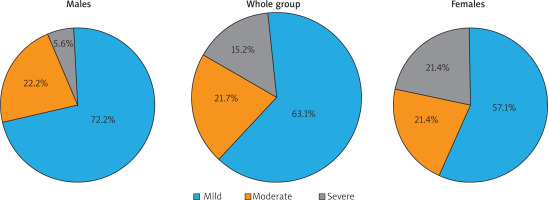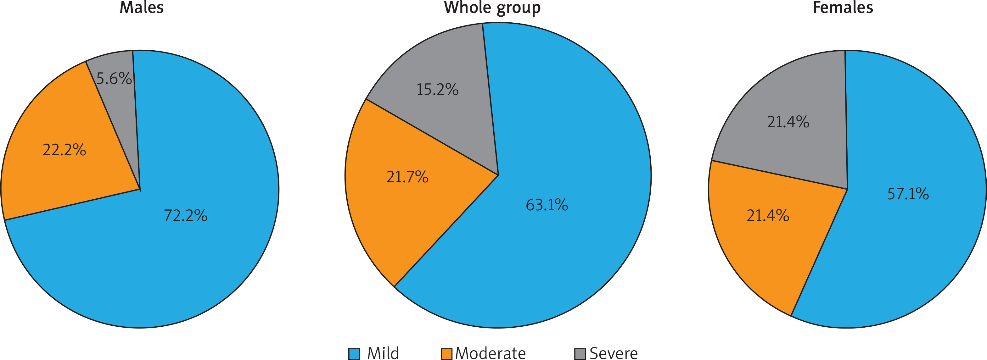 Anxiety was diagnosed in 46 (40.4%) HS patients. Although anxiety, similarly to depression, was more common among female patients (N = 28; 45.9%) than among male patients (N = 18; 34.0%), the difference between both groups did not reach statistical significance. Among all anxiety individuals, the vast majority suffered from mild anxiety – 29 (63.1%) patients. Moderate anxiety was documented in 10 (21.7%) patients and severe one in the remaining 7 (15.2%) subjects. No significant difference in the distribution of various severity levels of anxiety symptoms between females and males was noted (Figure 2). The mean GAD-7 score for the whole group was 4.5 ±5.0 points. The average GAD-7 scores were not significantly different between females and males (5.4 ±5.6 points and 3.5 ±4.0 points, respectively). The prevalence and severity of anxiety did not correlate with the disease severity, assessed with Hurley staging and IHS4. Among all studied relationships between anxiety and demographic and HS clinical data, we found only one weak, albeit significant, correlation between GAD-7 scores and duration of the disease (r = 0.197, p = 0.039).