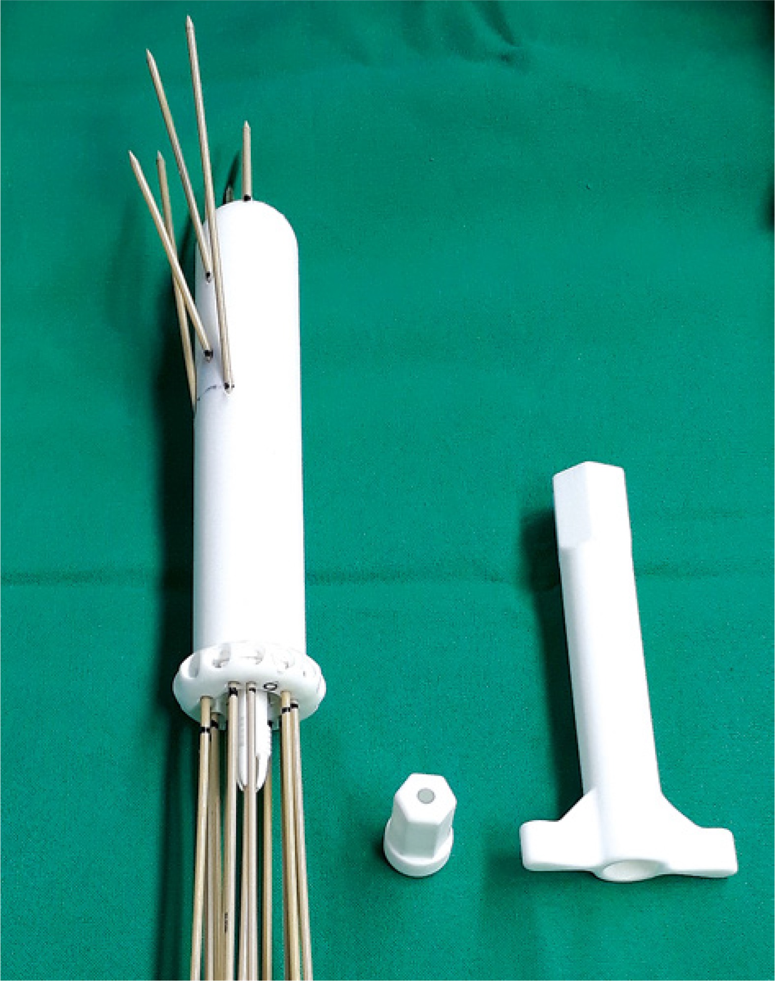 3D-printed multi-channel vaginal cylinder with intracavitary/interstitial needles. Appropriate for narrow vagina and multiple vaginal lesions. A handle (right) is used to tighten the nut (middle) on the collect chuck of the cylinder for needle fixation. It is used at the end of application to fix all the needles at the same time