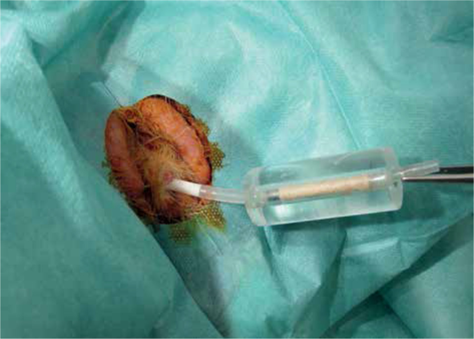 First, according to the study protocol, a defined stricture had to be generated in the rabbit urethra located about 15 mm distal to the colliculus seminalis. After application of 100 J of laser light energy, a pronounced induced stricture developed during the following 28 days, which was characterized both by cysto-urethrography and video-urethroscopy. According to the stricture classification, as shown in Figure 7, different stricture grades were observed, including grade 3 in 15 of 18 animals (83%), grade 2 in 1 of 18 animals (6%), and grade 1 in 2 of 18 animals (11%). To mimic the clinical treatment procedure, strictures were surgically slitted lengthwise at 12 o’clock, until the full width of lumen was reached. Immediately after surgical opening of the urethra, gamma-sterilized 14 Fr catheter carrying the specially developed 32P-foil roll was inserted. The foil position was matched with the stricture by radiography using two X-ray markers, and the catheter balloon was filled with contrast agent and blocked in the bladder neck. During the whole procedure, beta radiation was shielded by a 10 mm thick plexiglass cylinder covering the 32P-foil area (Figure 8). All individuals working with the radioactive catheter were equipped with ring batches and an extremity dosimeter.