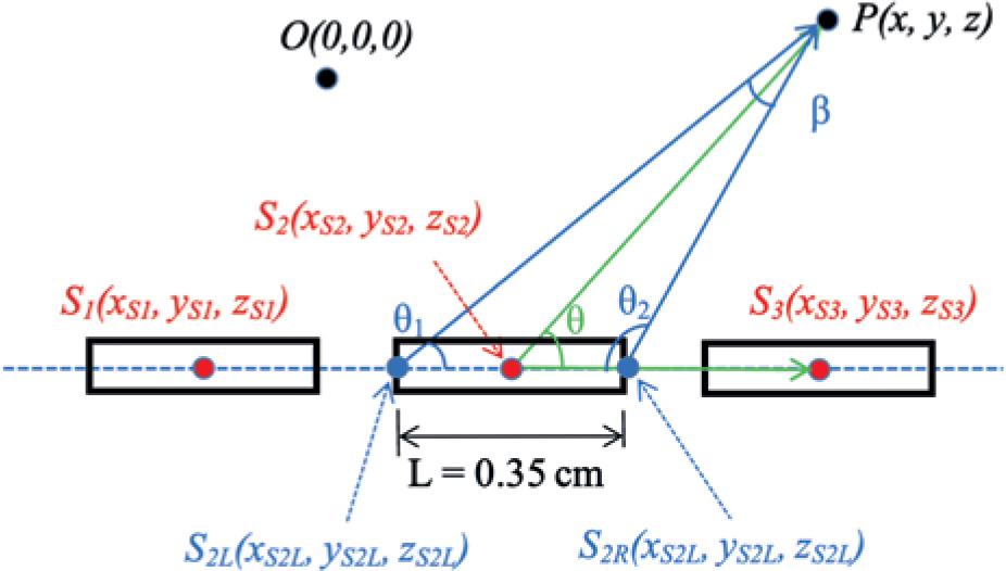 The angle β was determined from the sum of internal angles (180° = θ1 + θ2 + β) of the triangle, of which three vertices were S2L, S2R,, and P seen in Figure 1. The vector was defined as from the origin, and its unit vector was specified as . Therefore, the coordinates of both ends (S2L and S2R) for the source position S2 were determined using Eq. (3). The active source length of 192Ir HDR source for GammaMedplus iX was 0.35 cm, and half of the active source length was 0.175 cm in Eq. (3).
