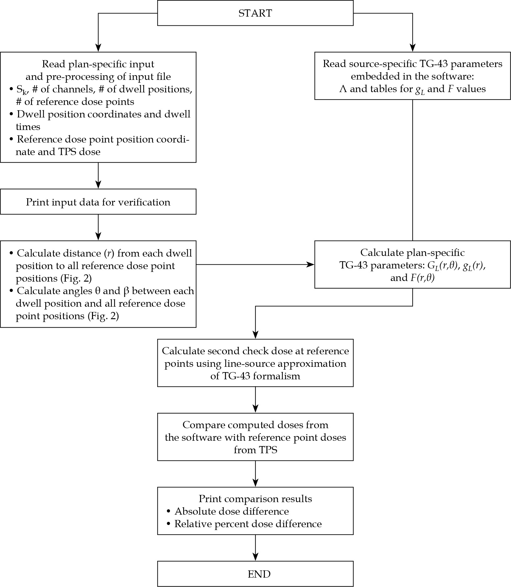 Other in-house second check software programs [4, 5, 7, 8] in the literature using TG-43 formalism are summarized in Table 2. Among the five parameters of TG-43U1, air-kerma strength and dose-rate constant are fixed values for a certain 192Ir HDR source and treatment plan. The determination of radial dose function is relatively straightforward due to the simplicity to calculate distance r and a single interpolation in gL(r) table. There are more variations in calculating the angle θ among studies, and thus geometry function and anisotropy function can differ from that of TPS. The current study describes in detail how to determine the angle β, which is essential for the geometry function in the line-source approximation.