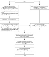 An HDR source-specific TG-43 parameter dataset was incorporated into a Python software. This dataset was verified by comparing with those in the AAPM Report 229 [10], and no discrepancy was identified. The step-by-step process of dose calculation using the software is outlined in Figure 2. It was noted that any number in the input file was considered as a character in the Python tool requiring conversion into numeric format for calculations. Plan-specific input data were imported from the treatment plan report, and plan-specific TG-43 parameters were determined by the distance r, polar angle θ, and angle β calculated between individual dwell positions and each reference dose point.