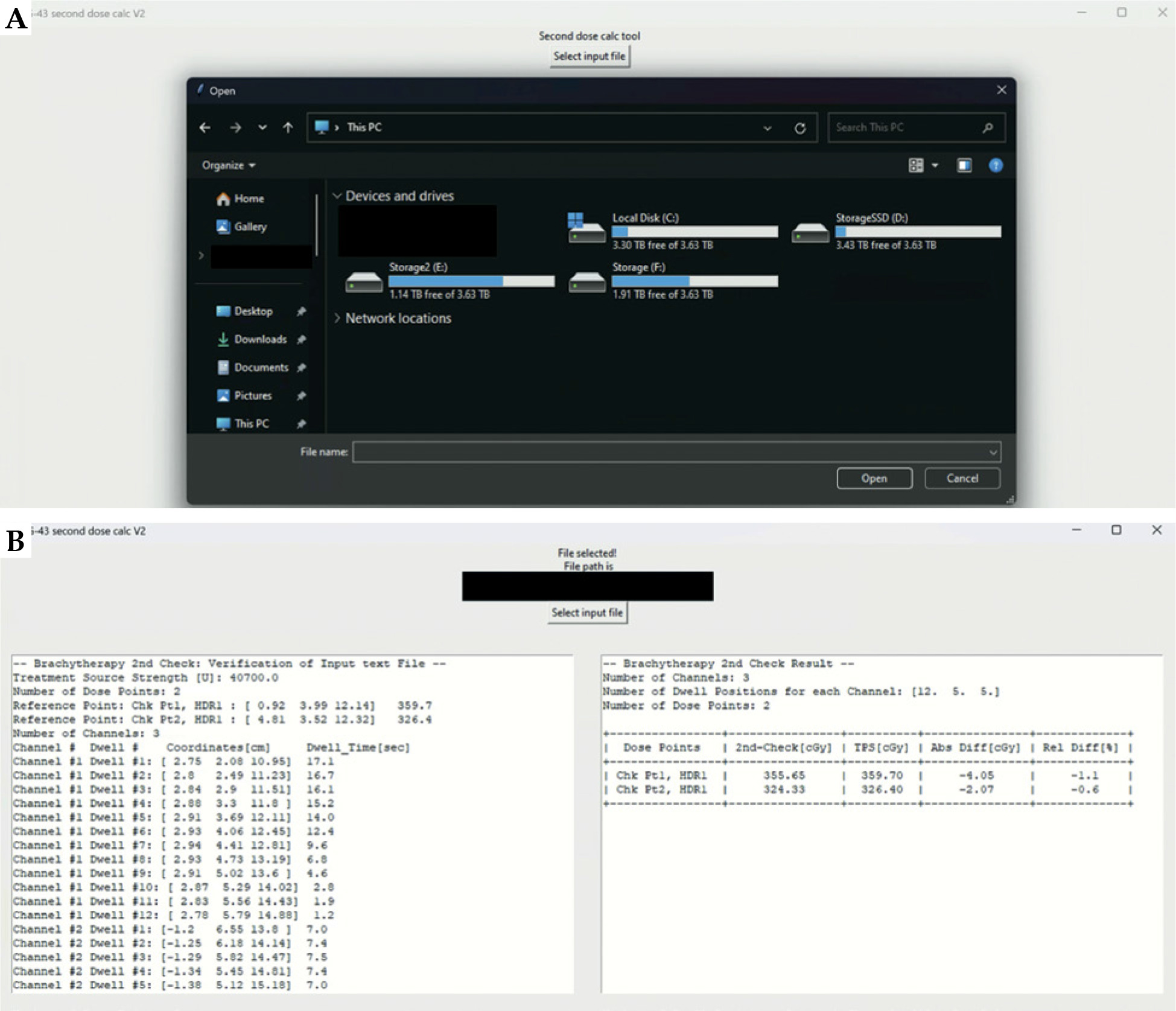 GUI of the developed software allows users to easily select an input file by clicking the select input file button, and indicate a text file from the drop-down window, as illustrated in Figure 3A. Once the input file is selected, the software window displays the file path, reads the input file, prints the verification of input data (Figure 3B) in the left text box, and shows real-time calculated dose computation results in the right text box (Figure 3B). Without the need to reboot the software, users can continue to select other input files for additional dose calculation tasks.