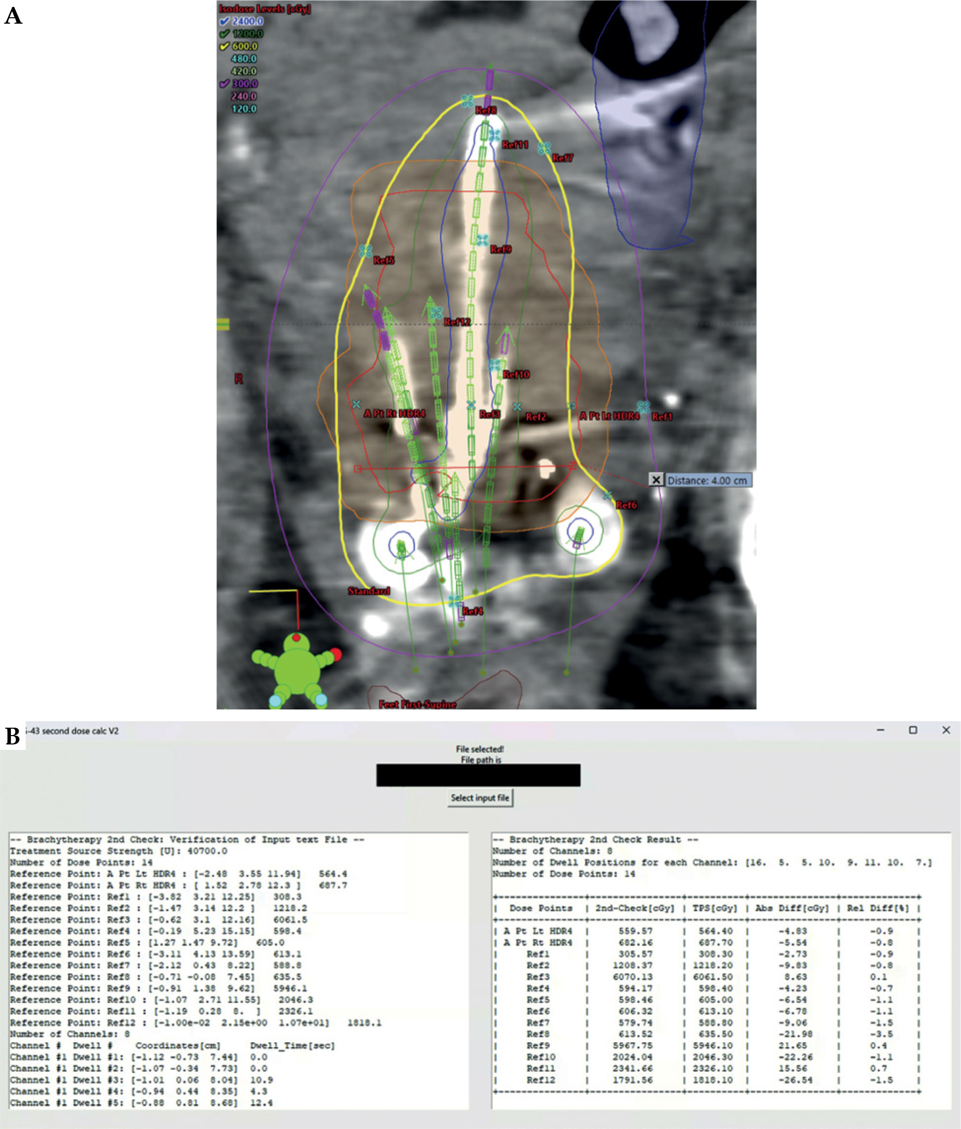 A commercial independent dose calculation software used in our institution (Brachy MUCheck, Oncology Data Systems, Inc.) imports a treatment plan file in DICOM format, which is exported from TPS (Varian BrachyVision, version 16.1.5). It requires access to the TPS for data transfer and communication. In contrast, this study utilized the treatment plan report as a text file input for the software, bypassing the need for DICOM files. A treatment plan report is printed in PDF (portable document format) file using the print layout option as “BrachyFull.tml” in the BrachyVision (version 16.1.5) TPS. All text from the PDF file is copied and pasted into a text file without any modification. The text file becomes the input file for the software, and the software automatically reads the input text file. In most other institutions, source decay is taken into account in TPS and treatment source strength for a treatment plan is different from nominal strength due to source decay. In contrast, in our institution, the nominal source strength is used for the treatment planning, and therefore source strength in any treatment plan is the same as the nominal source strength. The source decay is accounted for at HDR afterloader console computer. When the console computer reads the transferred treatment plan from the TPS, dwell times are automatically scaled by the ratio of source strength (nominal/treatment). Because the second check software reads the treatment source strength from the treatment plan report, the nominal strength is read for the treatment source strength in our institution, while decayed source strength is read for the treatment source strength in other institutions. Information extracted from the input file includes the treatment source strength, number of channels, dwell position coordinates, and dwell times for each channel as well as reference point coordinates and doses. Additionally, no patient-related protected health information (PHI) is accessed, recorded, nor utilized by the software.