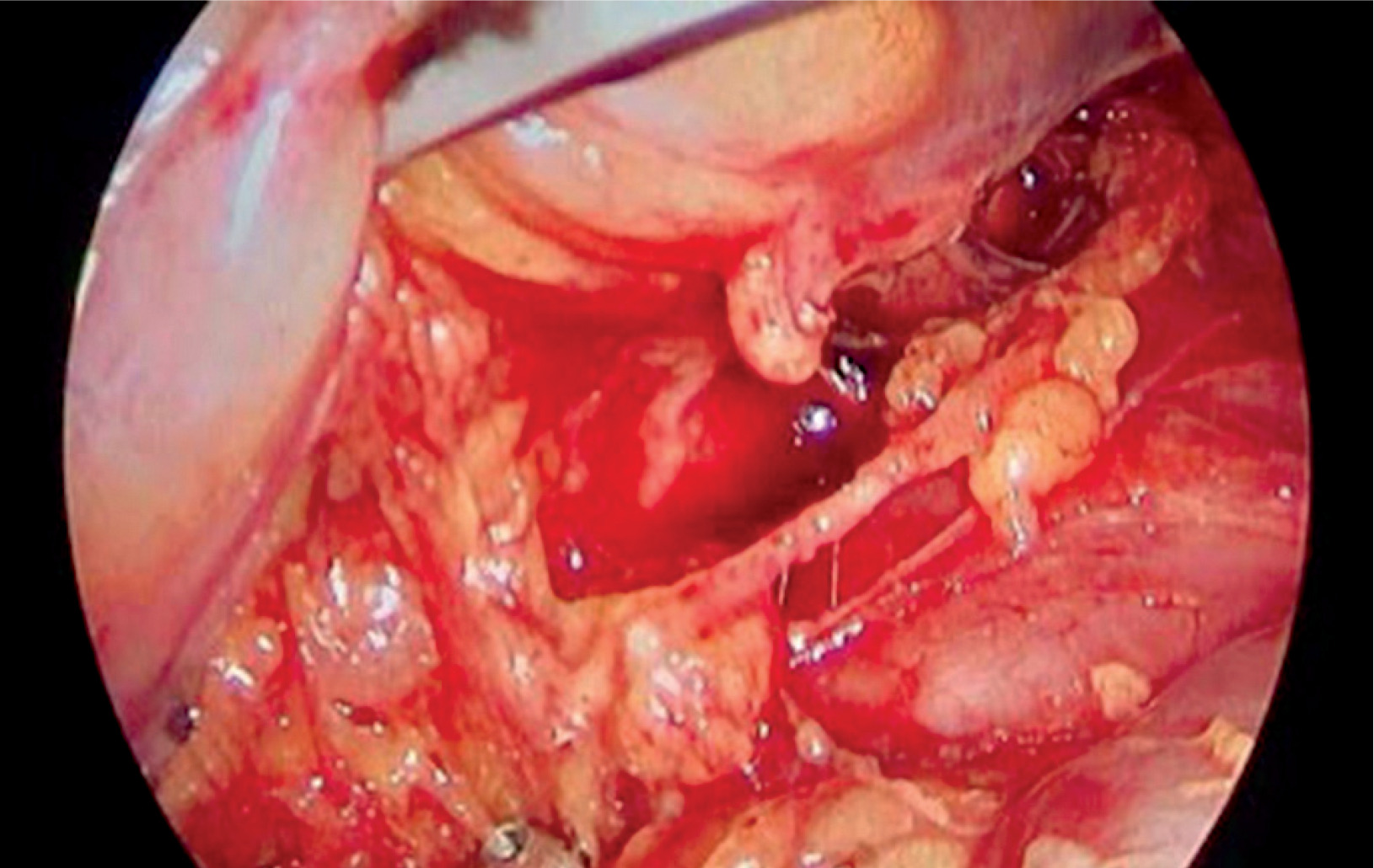 On November 7th 2024, the surgery was performed via right-sided video-assisted thoracoscopic access (VATS), a pleural biopsy was taken, and a wedge resection of a nodule in the lower lobe was performed. No obvious cause of the chylothorax was identified. Therefore, it was decided to ligate the thoracic duct just above the diaphragm (Figure 1). During the postoperative period, there was no significant reduction in chyle output, with drainage volumes remaining at a similar level – 500–1000 ml. Cytological examination of the pleural fluid was performed twice, in November and December; in both cases, no malignant cells were detected. A CT scan of the thoracic and abdominal cavity was performed, revealing the presence of low-density fluid in the left pleural cavity, measuring 3 cm in width, along with atelectatic changes in the adjacent lung tissue. Surgical clips from previous thoracic duct clipping were visible. Additionally, a small amount of fluid was detected in the abdominal cavity around the splenic margin. A CT scan of the pelvis did not show any abnormalities. A hematology consultation revealed no evidence of lymphoproliferative or myeloproliferative disorders. During an internal medicine consultation, a suspicion of a hospital infection was raised. On auscultation, crackles were heard on the left side, and decreased breath sounds were noted in the basal region on the right. It was recommended to initiate treatment with piperacillin/tazobactam. Infectious disease diagnostics were negative for syphilis, Cryptococcus, Aspergillus, and Candida. In the following postoperative days, a gradual deterioration of the patient’s general condition was observed. Staphylococcal sepsis and pneumonia were diagnosed. The patient was transferred to the ICU for further treatment due to a drop in blood pressure and sudden circulatory failure. During the ICU stay, antibiotic therapy was continued according to the protocol for managing patients with Staphylococcus aureus bacteremia. The patient required drainage of the left pleural cavity, as well as additional drainage of the right pleural cavity. Ultrasound of the jugular veins revealed a past thrombosis in the left internal jugular vein, collateral circulation, and a thrombus at the junction of the right subclavian vein.