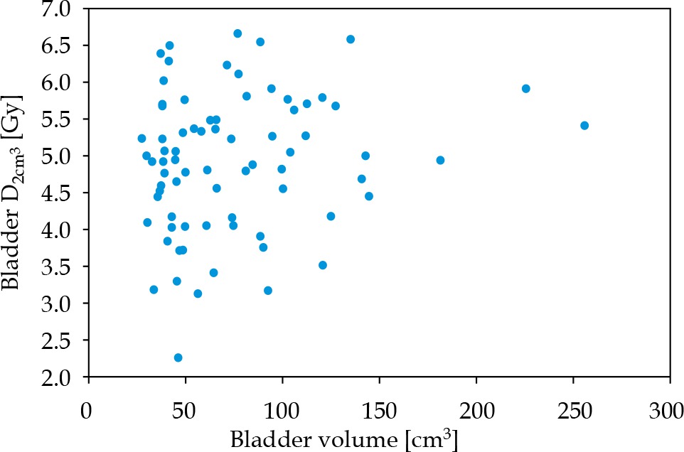 The bladder volume in the volume range of 27-256 cm3 was not associated with an increase in Dmax (p = 0.77) or D2cm3 (p = 0.181) in Student’s t-test. Bladder D2cm3 vs. bladder volume are presented in Figure 3. In the second analysis, bladder volumes were divided into three equally numerous groups: < 46 cm3, 46-84 cm3, and > 84 cm3, for a comparison. There were no bladder volume effect on bladder doses noted, D2cm3 (p = 0.597) and Dmax (p = 0.229).