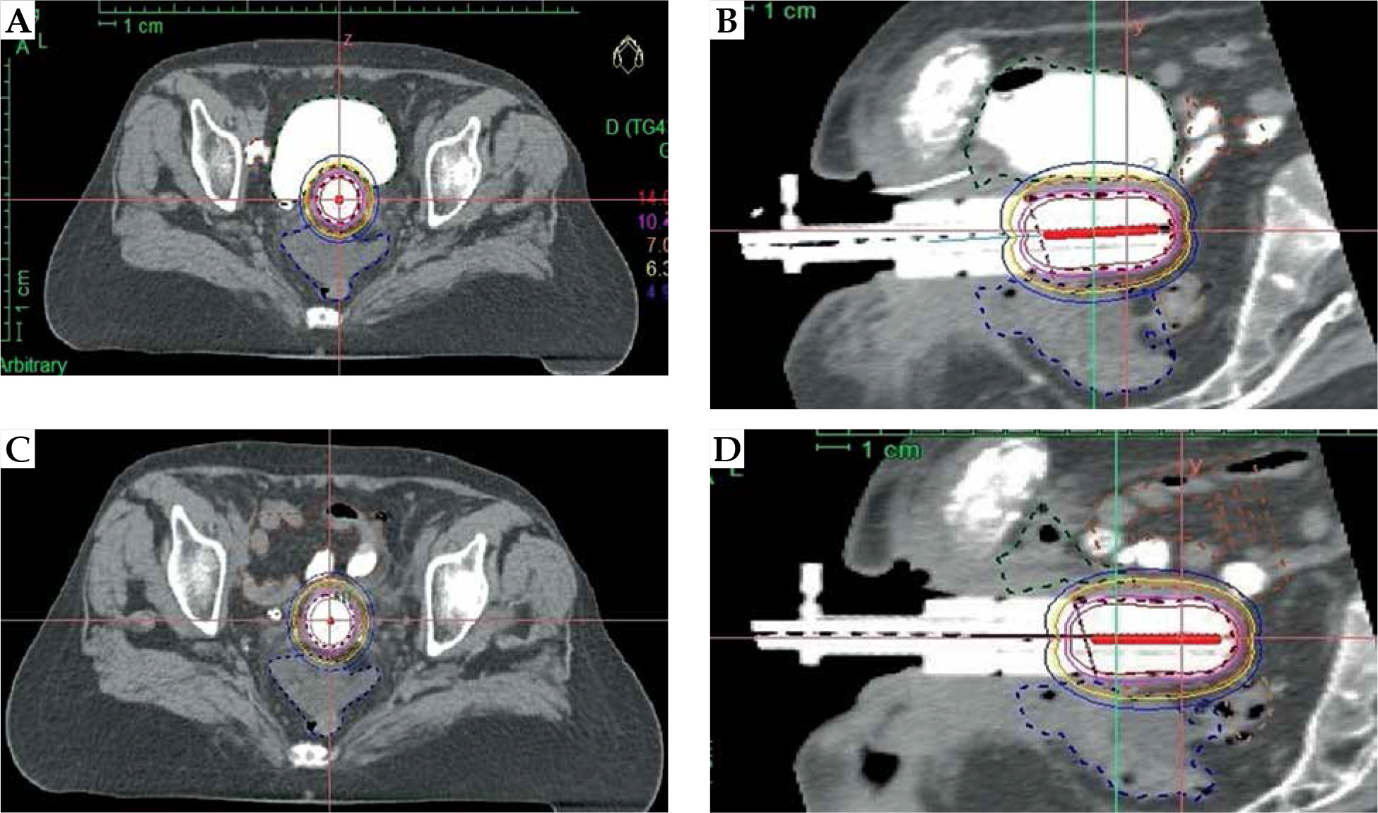 Organs at risk (OARs) in axial with full bladder (A) and sagittal with full bladder (B) (small bowel with barium contrast displaced anteriorly, superiorly, and laterally); in axial with empty bladder (C) and sagittal direction with empty bladder (D) (small bowel loops with barium contrast located very close to the cylinder)