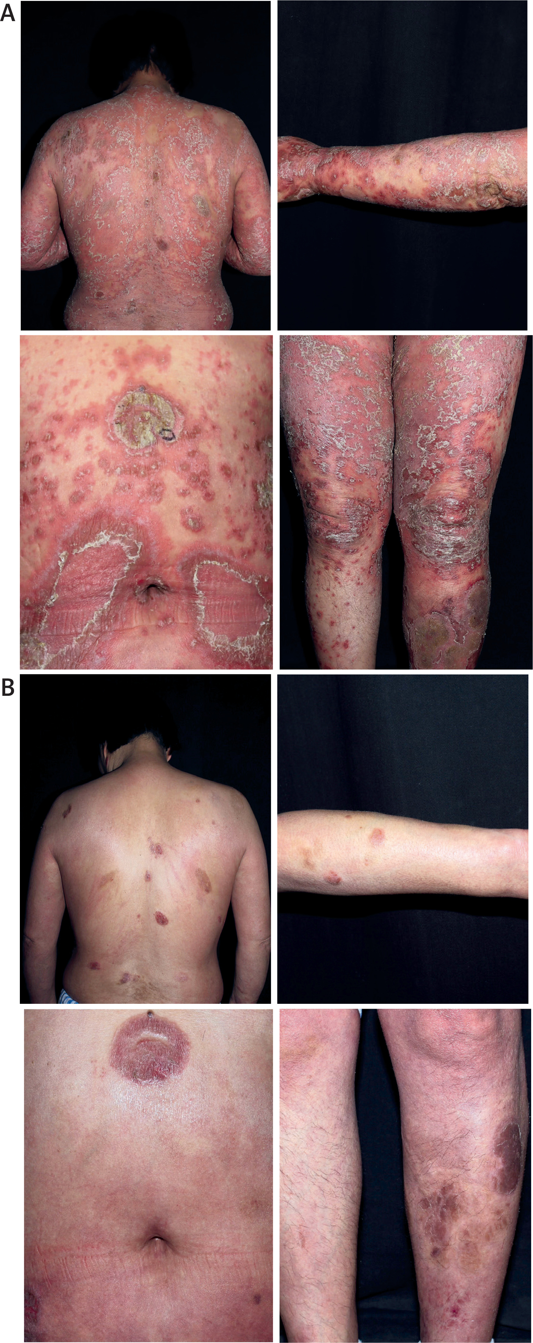 A 50-year-old Chinese woman presented with a widespread pruritic rash and pustules persisting for 40 days. She had a prior diagnosis of AD, confirmed by recurrent eczema-like eruptions, elevated IgE levels and eosinophils according to the guidelines [2]. Treatment with dupilumab (600 mg initial dose followed by 300 mg every 2 weeks) was initiated. After the first injection, her AD symptoms improved significantly. However, following the second dose, scattered patches of redness and pustules developed on her trunk and limbs. These lesions worsened after the third dose, progressing to full-body involvement (Figure 1 A). Dupilumab was discontinued.