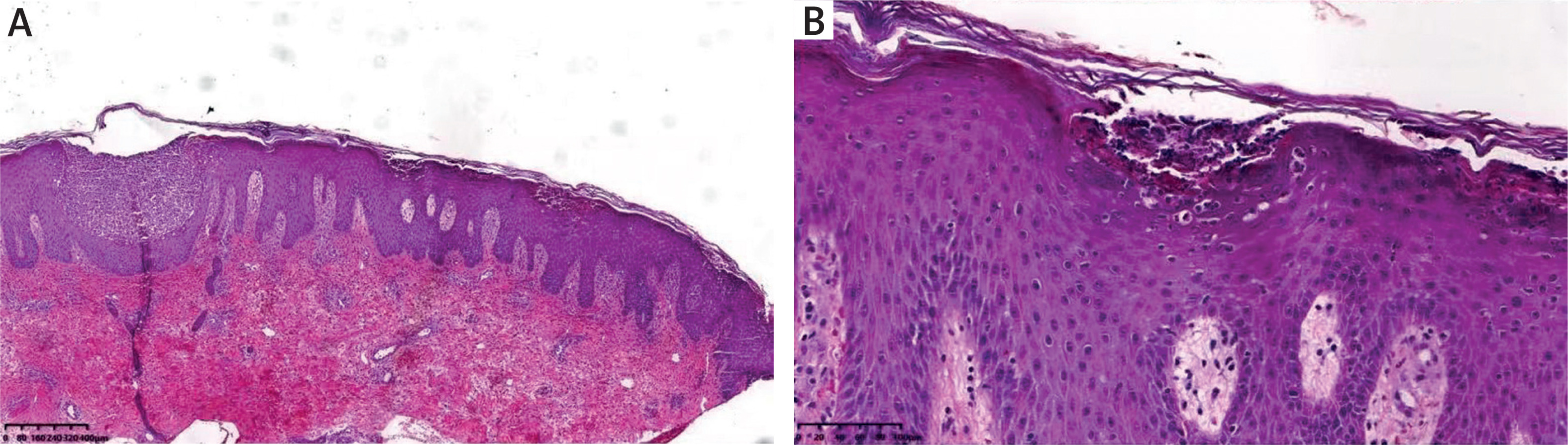 Pustule cultures were negative for bacterial growth. Pathological examination revealed epidermal hyperkeratosis with hypokeratosis, Kogoj microabscesses, thickening of the acanthotic layer, large pustules below the stratum corneum, and significant amounts of central granulocyte infiltration in vesicular cavities (Figure 2). Based on clinical and pathological findings, GPP was diagnosed. The patient was started on oral acitretin (40 mg/day), leading to lesion resolution and pruritus improvement within 2 weeks (Figure 1 B). The dose was tapered to 30 mg/day after 2 weeks, then 20 mg/day after 4 weeks. Acitretin was discontinued after 2 months with no recurrence of AD or GPP during a 1-year follow-up.