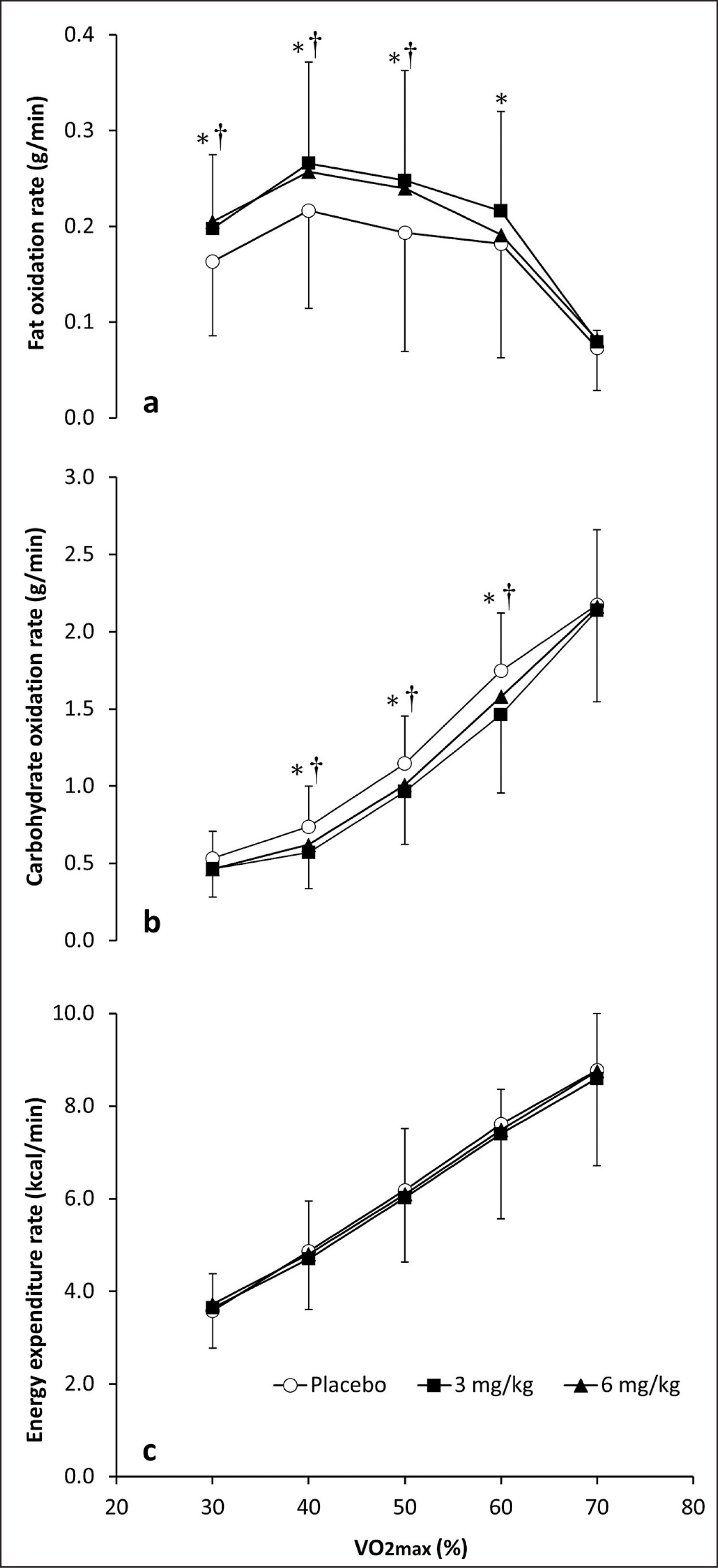 Rates of fat oxidation (a), carbohydrate oxidation (b) and energy expenditure (c) during exercise of increasing intensity after the ingestion of 3 and 6 mg/kg of caffeine or a placebo.