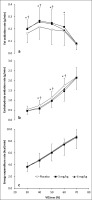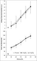 Figure 2 depicts the effect both 3 and 6 mg/kg caffeine on the rating of perceived exertion and heart rate during exercise at increasing intensity. There was a significant effect of exercise intensity (F4,10 = 82.522; p < 0.001) on the rating of perceived exertion, while no effect of substance or substance × exercise intensity interaction was observed for this variable. There was also a significant effect of exercise intensity (F4,10 = 63.622; p < 0.001) on heart rate, whereas no effect of substance or substance × exercise intensity interaction was observed.