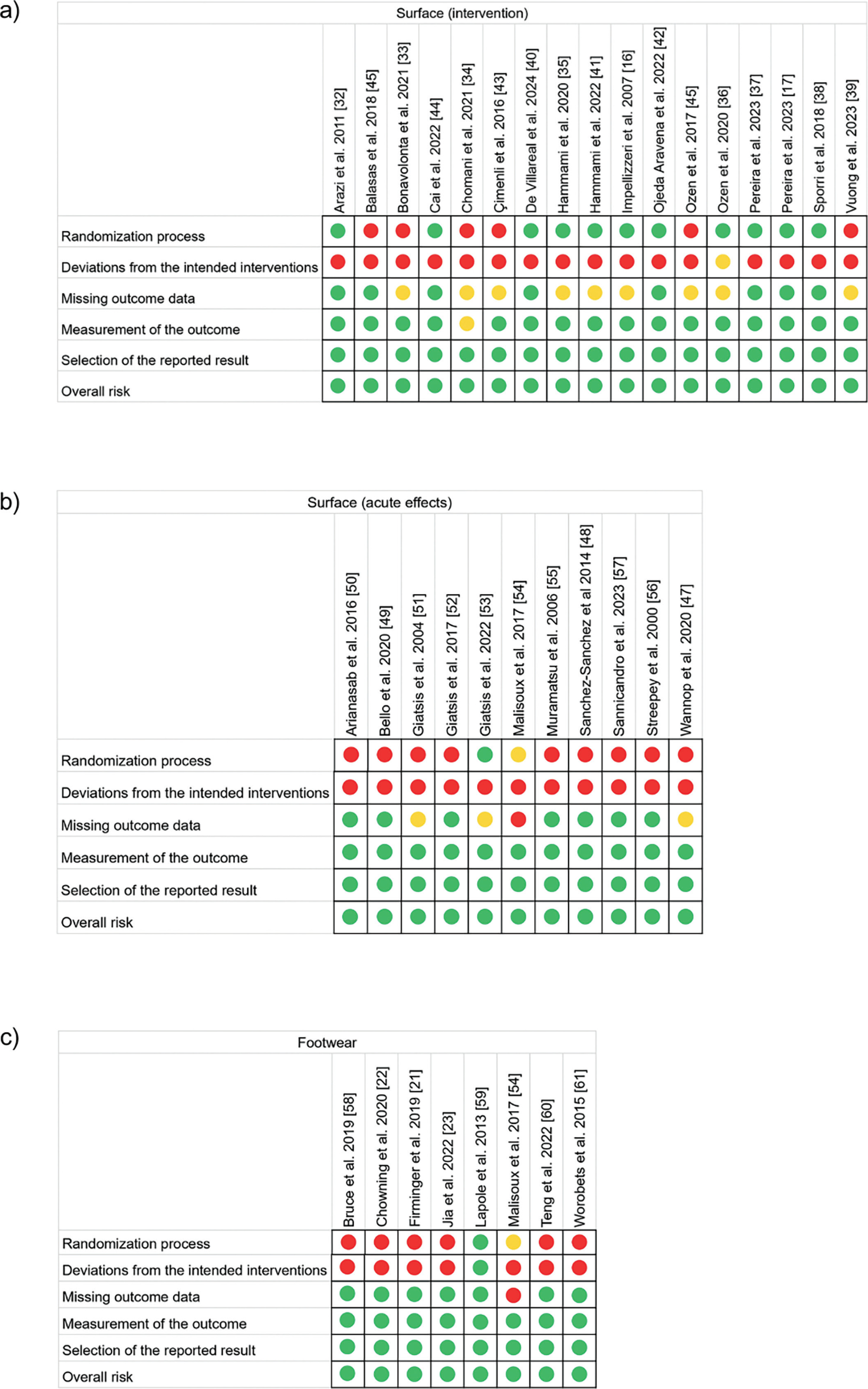 The results of the risk of bias assessment are shown in Figures 2. Overall, the randomization process was clearly described in 37% of the articles (intervention process surface [11/17], acute effects surface [1/11], and footwear [1/8]). This is primarily because several of the acute effects and footwear studies did not randomize their samples. The risk of bias due to deviations from the intended interventions was high in 94% of the articles, as participants were aware of their group, which is common in sport science research. There was a low risk of bias for missing outcome data in 63% of the studies, while the remaining 31% presented an unclear risk of bias. The risk of bias in outcome measurement was very low (97%) due to the validity of the evaluation instruments. Finally, all included studies presented a low risk of bias in the selection of the reported results.