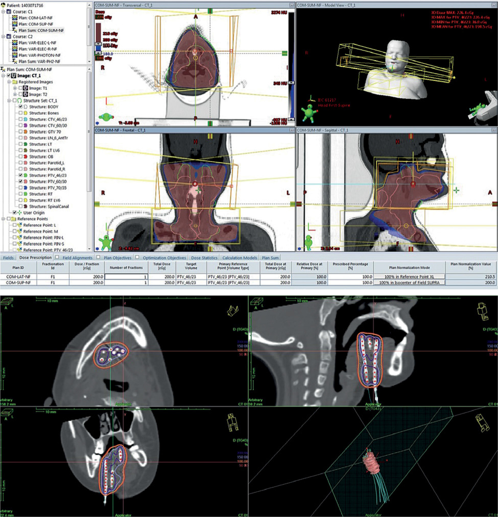 In recent years, significant advancements have been made in the adjuvant treatment after curative surgery in TSCC patients. Two prominent treatment modalities, which gained substantial attention are external beam radiotherapy (EBRT) and interstitial brachytherapy (BT) [9]. Furthermore, updated GEC-ESTRO guideline focused on the modern BT therapy as a successful treatment for function preservation and cosmetic outcomes in head and neck cancers [15]. EBRT performed by various techniques, involves using a linear accelerator to deliver high-energy radiation beams externally to the tumor site, and targeting the primary tumor bed and regional lymph nodes. In contrast, BT utilizes the placement of radioactive sources directly into the tumor bed, allowing for precise and localized radiation delivery [16, 17]. Both approaches aim to deliver targeted radiation to the tumor site to eradicate residual disease and improve patient outcomes [18]. The critical difference between these techniques lies in their radiation delivery characteristics. EBRT provides a non-invasive approach that can cover a more extensive treatment field, while interstitial BT offers a more conformal and concentrated dose distribution, but requires sufficient skills and a learning curve [19-21]. The choice of a technique depends on various factors, including tumor stage, location, surgical bed anatomy, and patient-specific considerations.