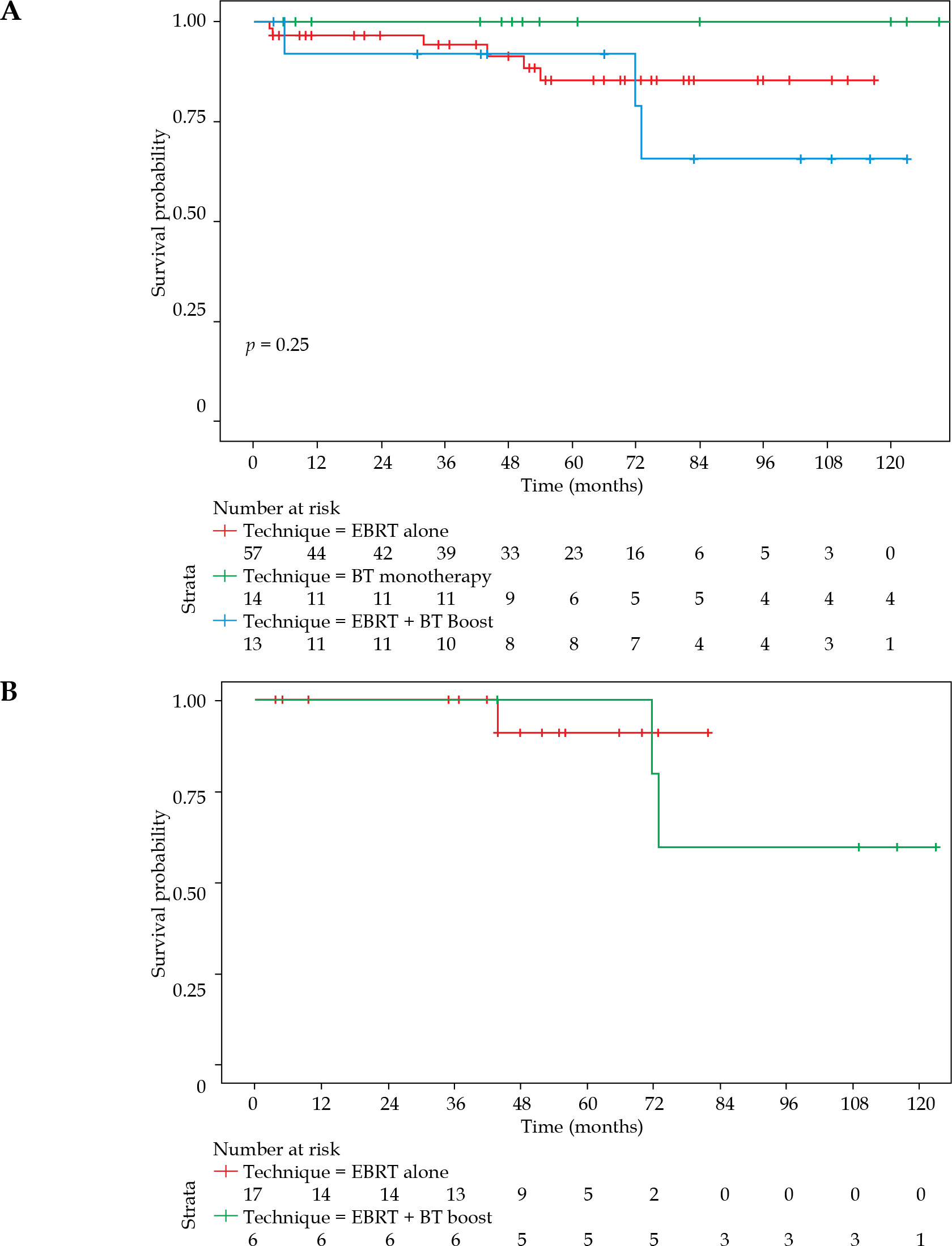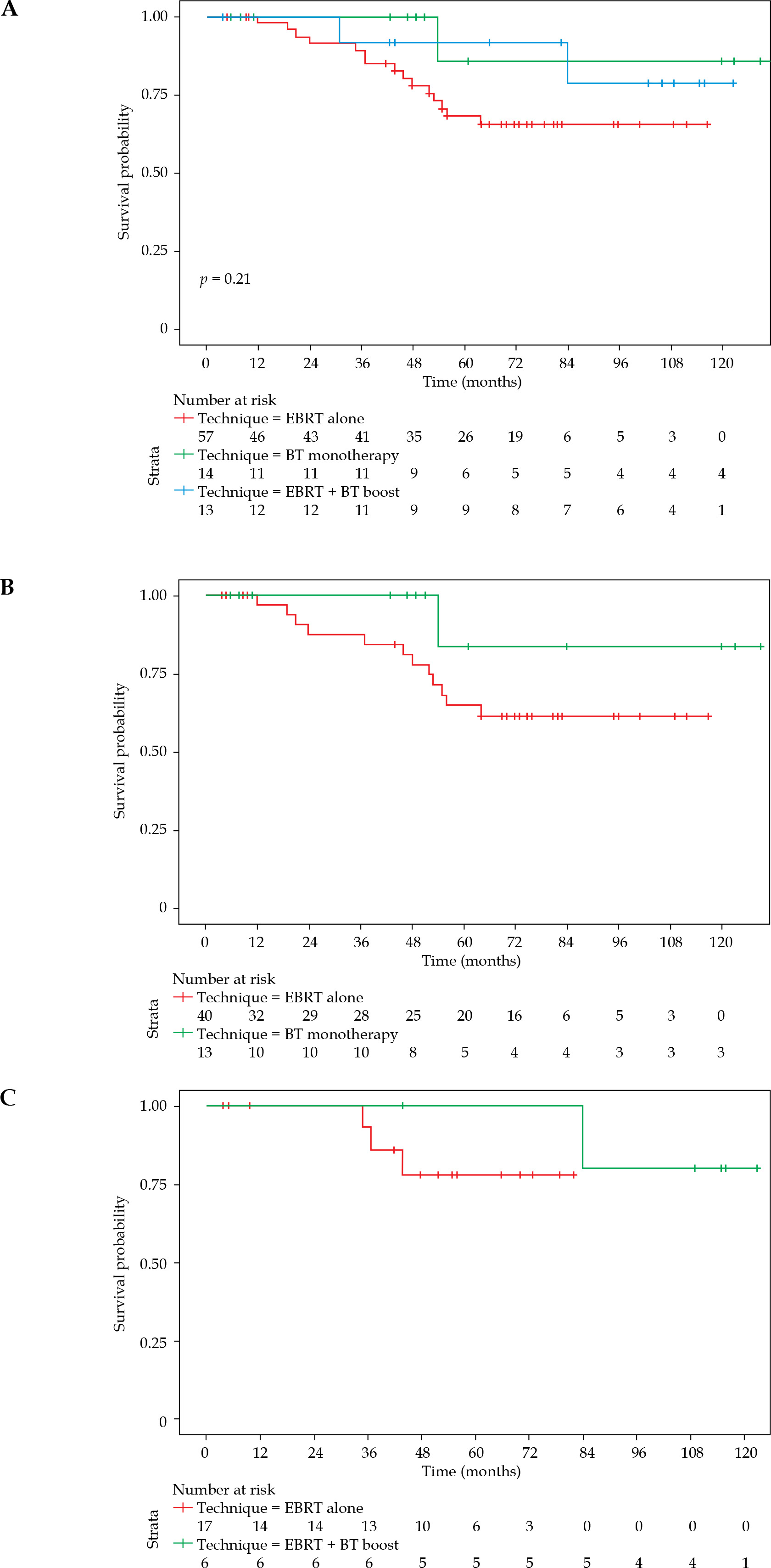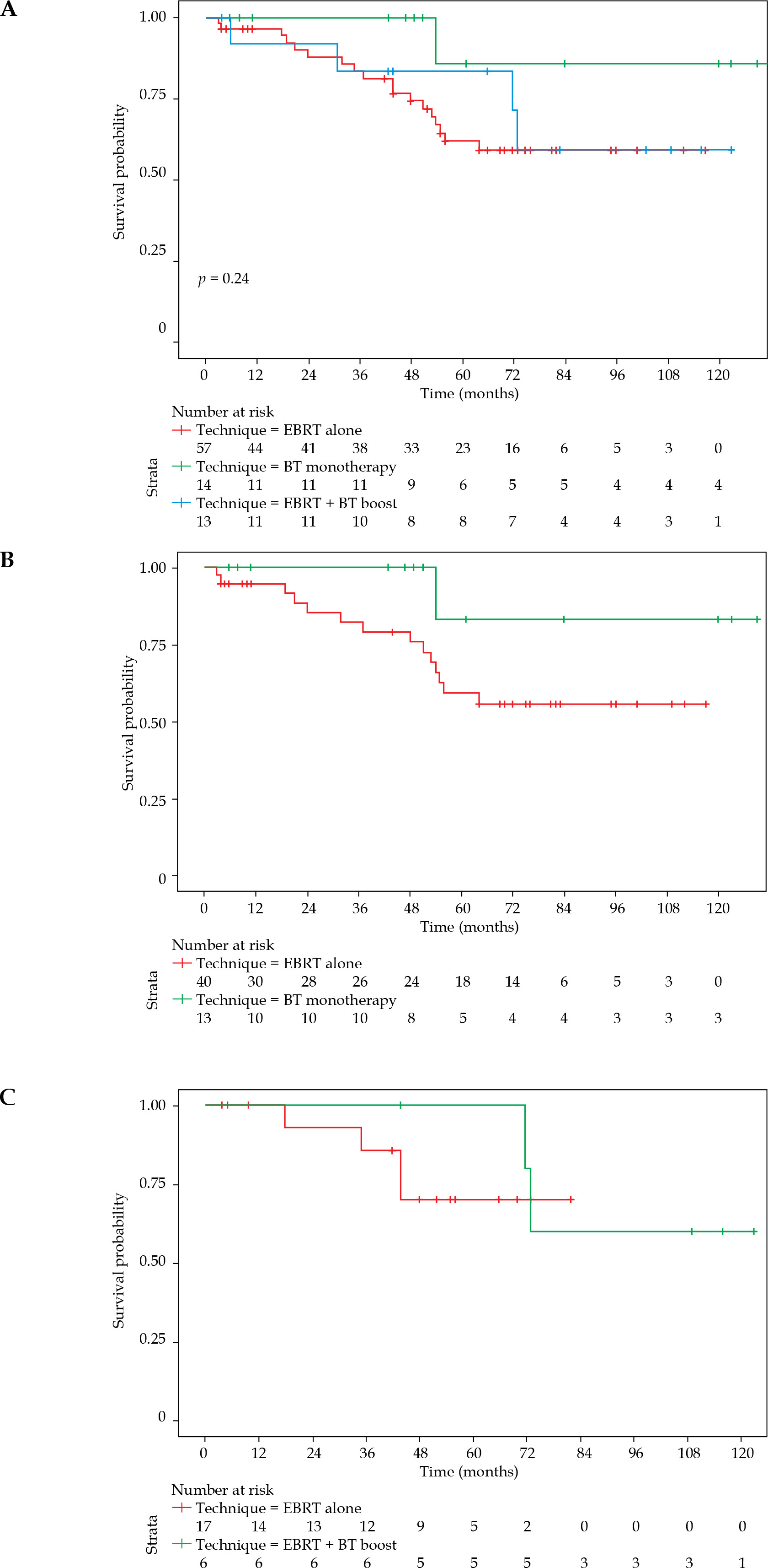 The 5-year rates of OS, DFS, and LRC are shown in Table 3. As evident, implementation of BT was associated with higher loco-regional control, and consequently improved DFS and OS. When focusing on RT technique, although non-significant, a trend towards better outcomes was observed by applying BT as monotherapy in early stage and as a boost in locally advanced cases compared with EBRT alone. However, there were nuances in these observations. It is important to be aware that cases selected for BT, either as monotherapy or as a boost, are generally fewer and easier to access than those selected for EBRT alone. However, in the current study, the differences were non-significant based on Kaplan-Meier and log-rank tests.