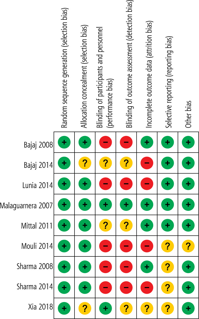 Two out of nine studies lacked adequate data to render a verdict on concealment of allocation. Five studies made no blinding of study personnel or participant and outcome assessors. Four studies have a high attrition rate (Fig. 1).
