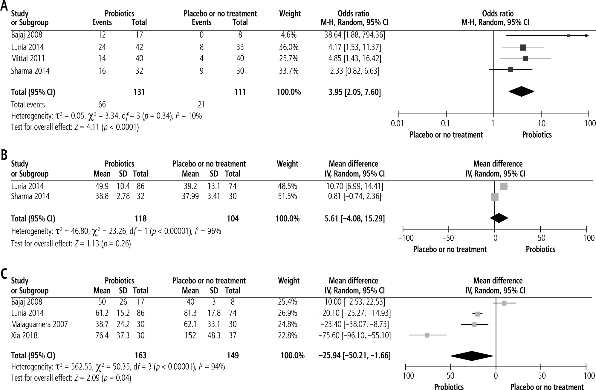 Comparison of outcomes between probiotics group and placebo or no treatment group. A) Effect on reversal of MHE; B) Effect on improvement of CFFT; C) Effect on reduction of serum ammonia